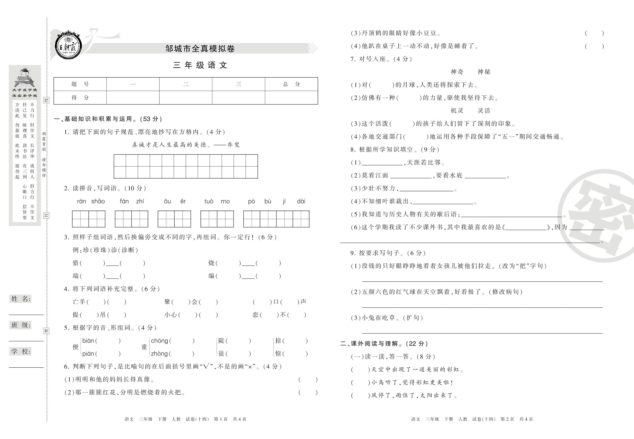2015-2016学年第二学期邹城市全真模拟卷三年级语文试卷(人教版)【14】