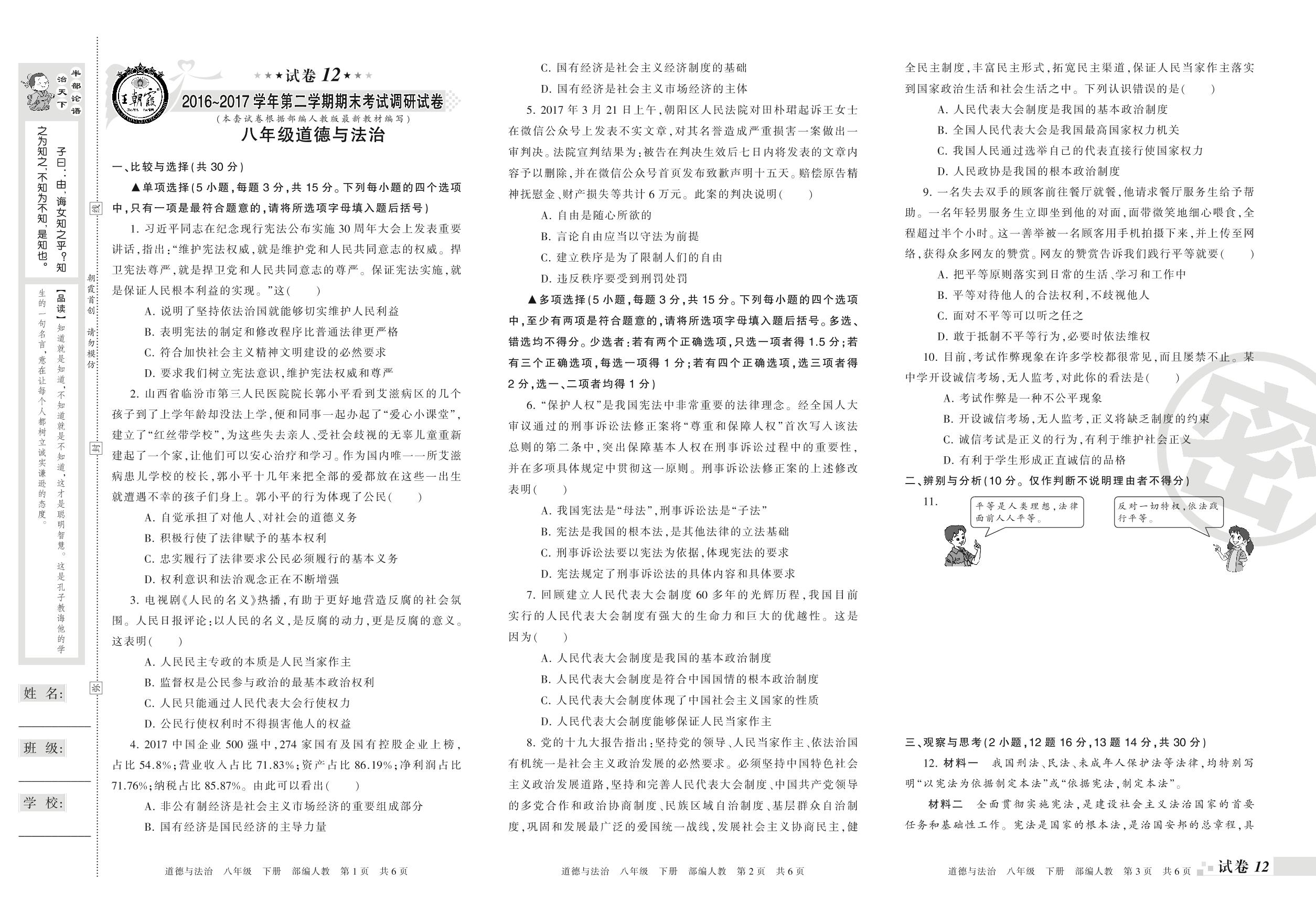 2016-2017学年第二学期期末考试调研试卷八年级下册道德与法治(人教版)【12】