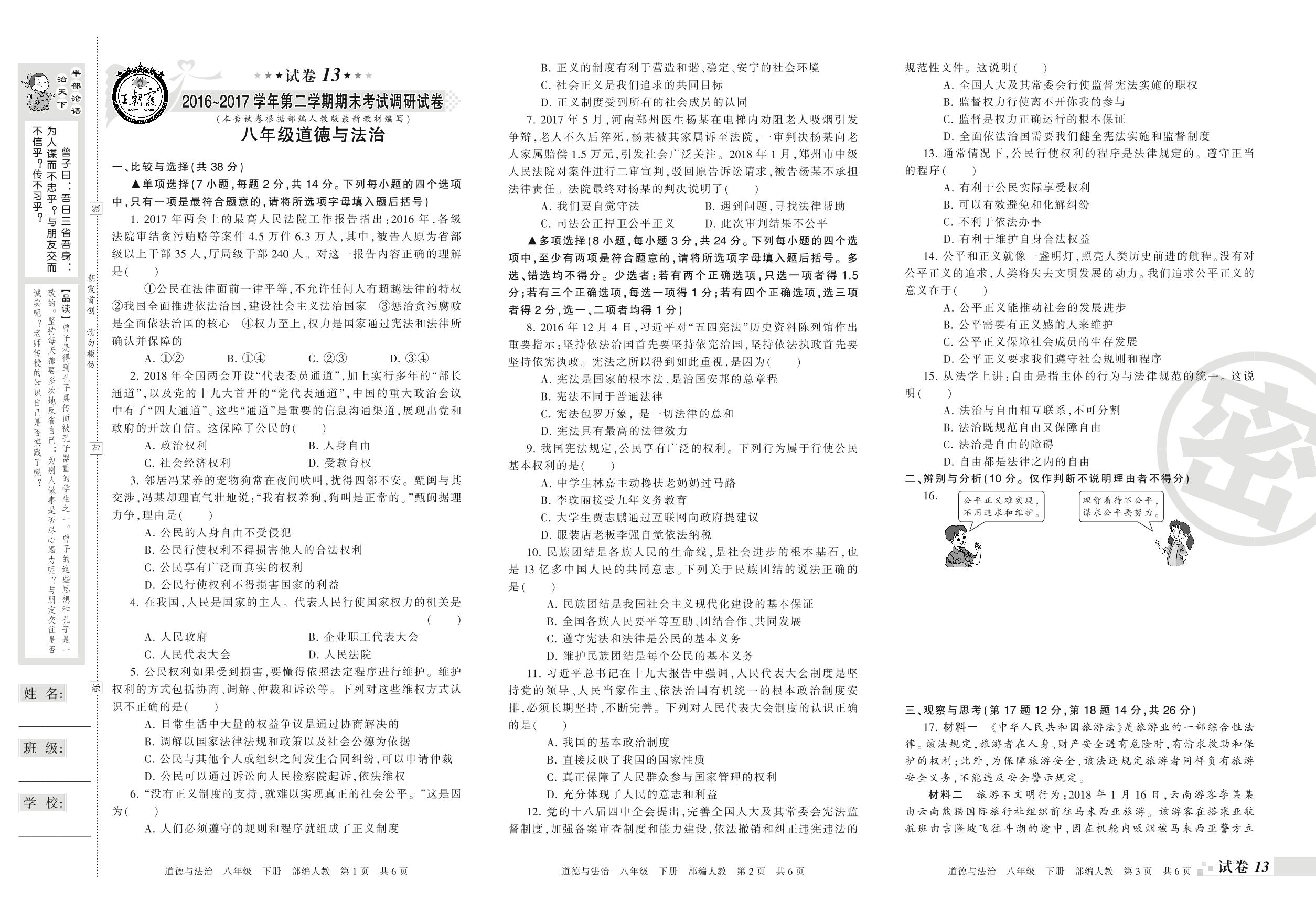 2016-2017学年第二学期期末考试调研试卷八年级下册道德与法治(人教版)【13】