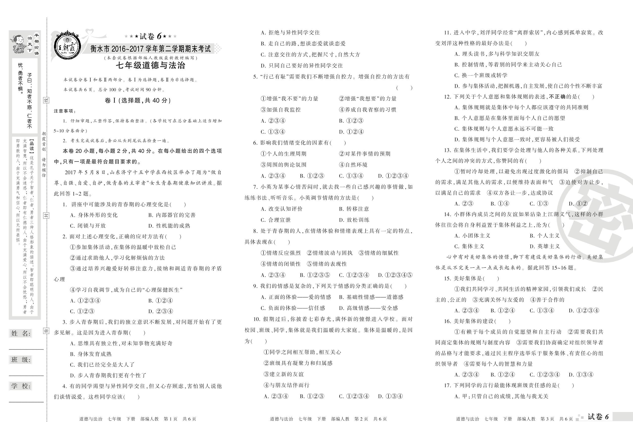 2016-2017学年第二学期衡水市七年级道德与法治试卷(人教版)【6】