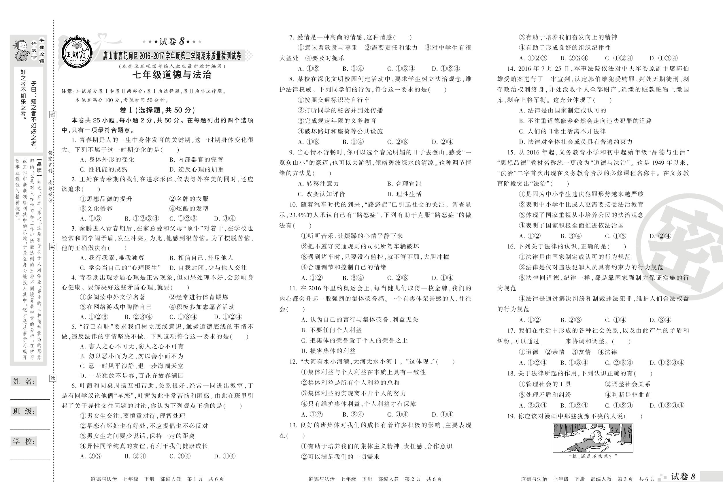 2016-2017学年第二学期唐山市曹妃甸区七年级道德与法治试卷(人教版)【8】