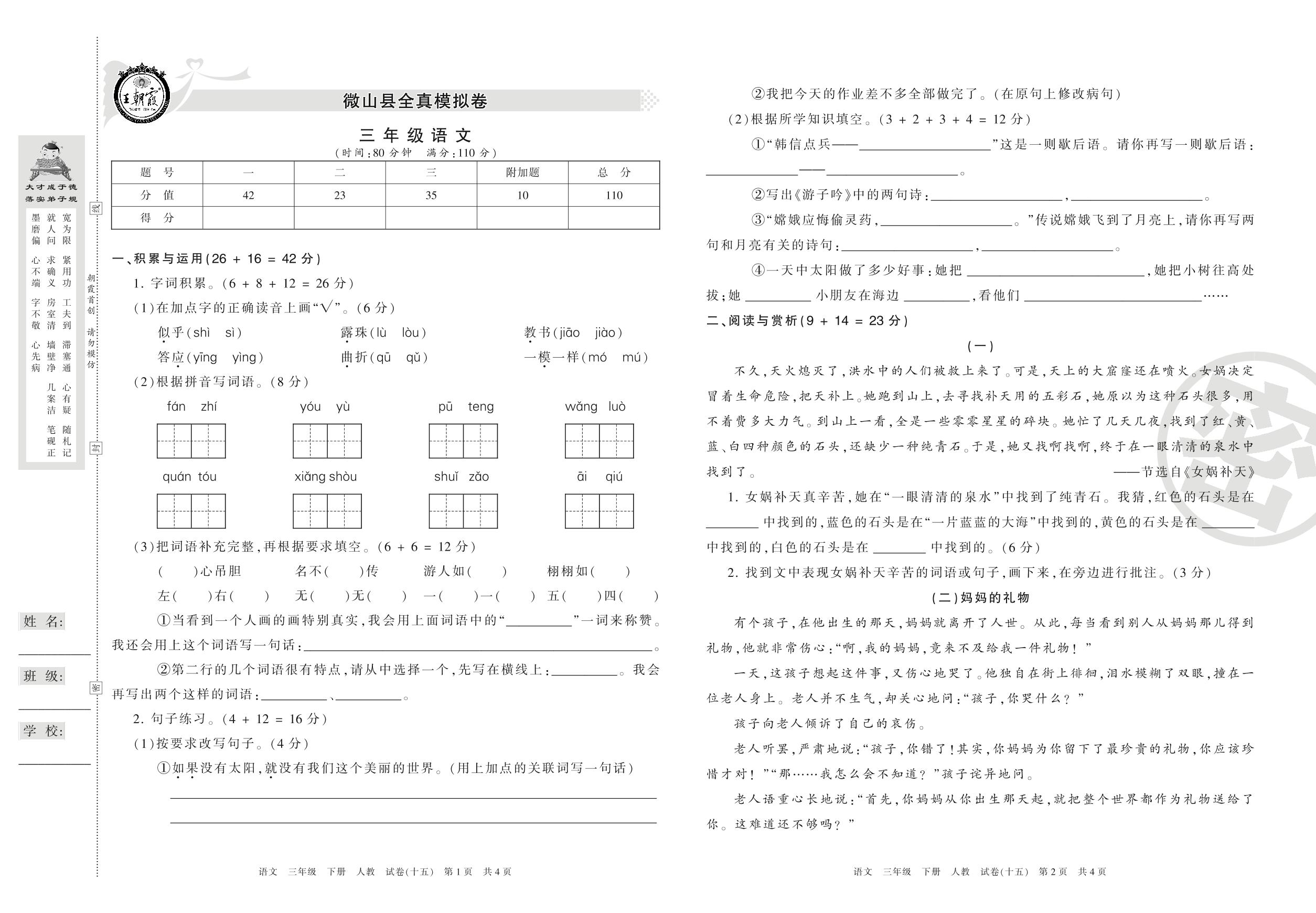 2015-2016学年第二学期济宁市微山县全真模拟卷三年级语文试卷(人教版)【15】