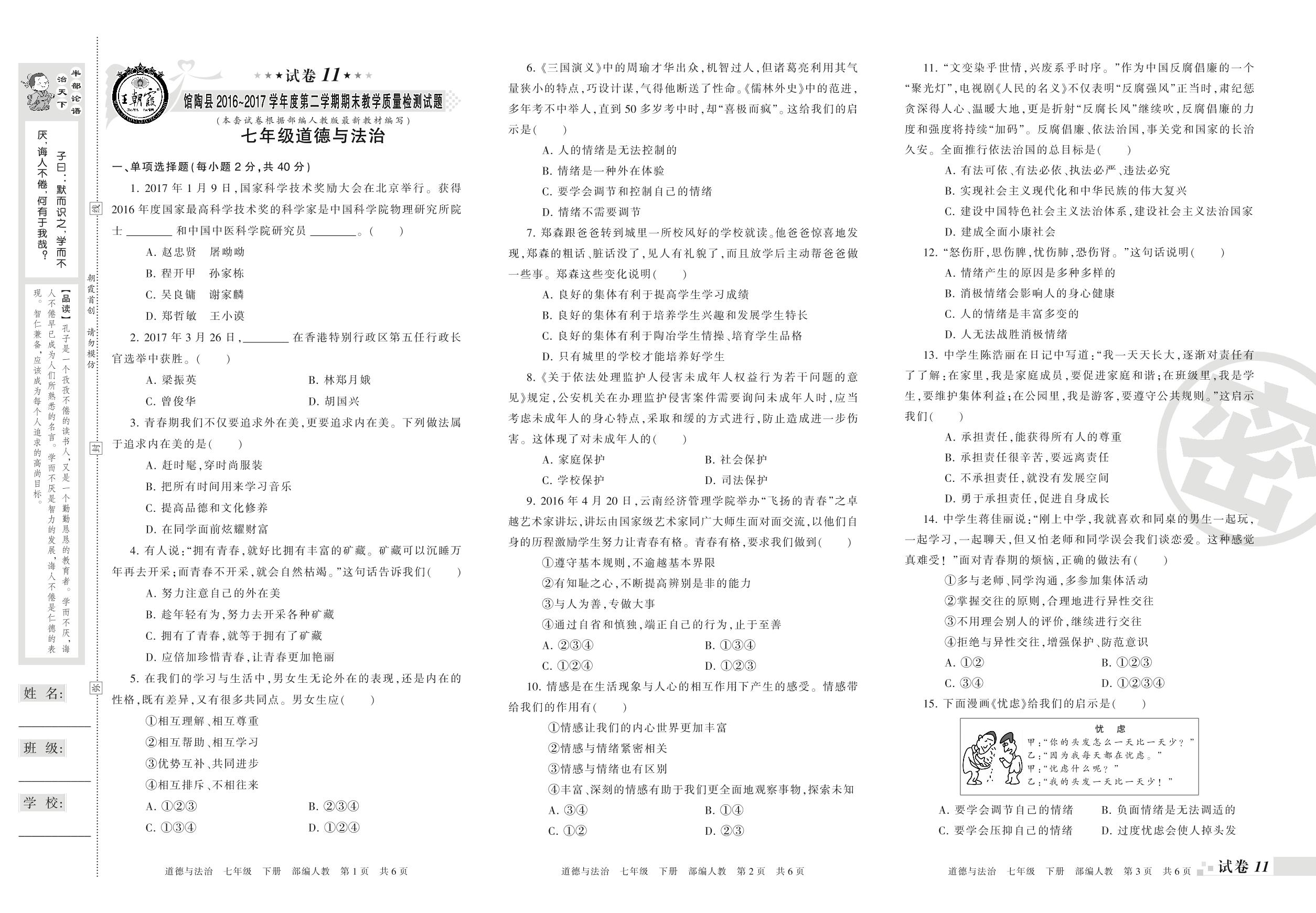 2016-2017学年第二学期邯郸市馆陶县七年级道德与法治试卷(人教版)【11】