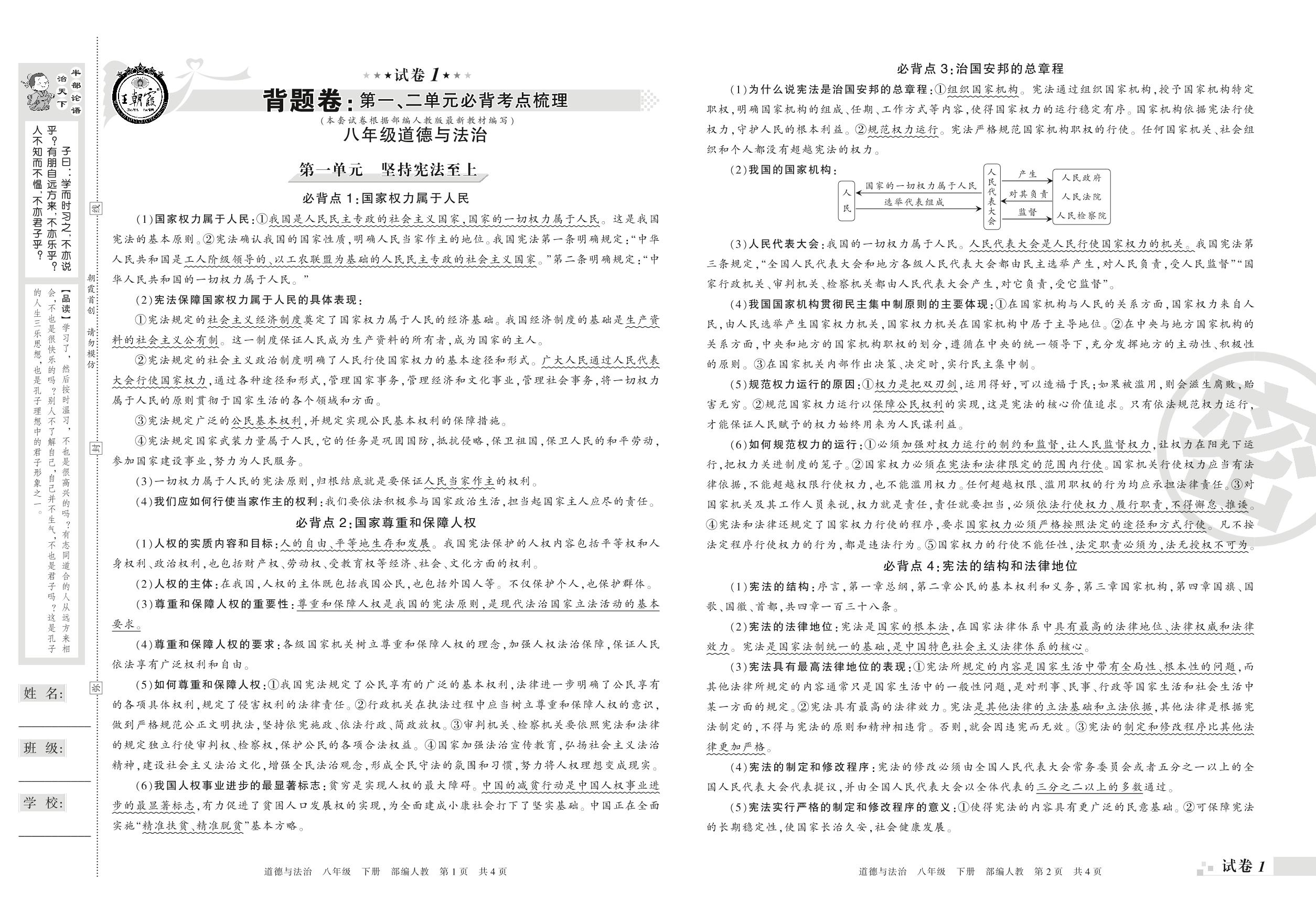 王朝霞期末背题卷——第一、二单元必背考点梳理八年级下册道德与法治(人教版)【1】