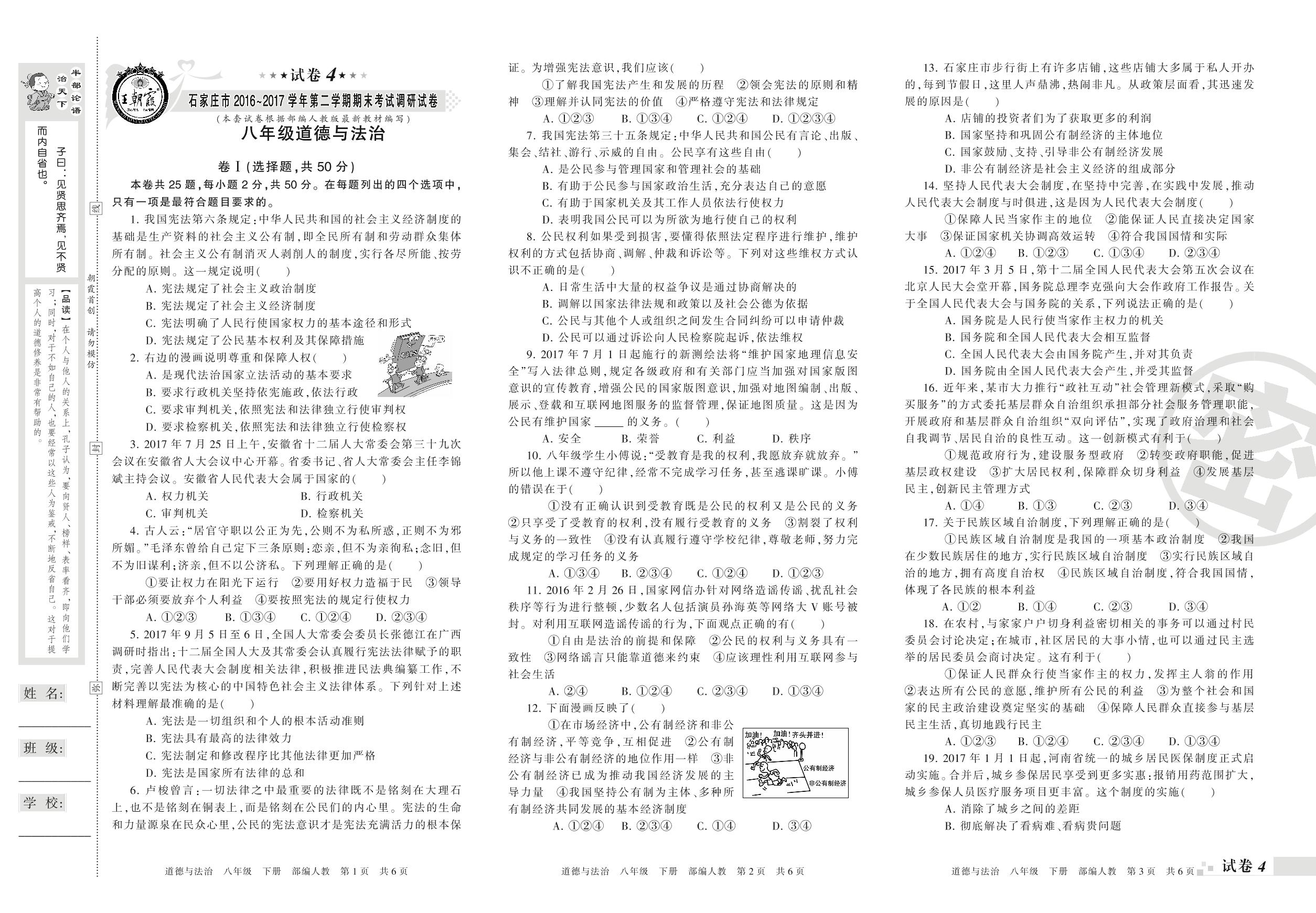 2016-2017学年第二学期石家庄市八年级道德与法治试卷(人教版)【4】