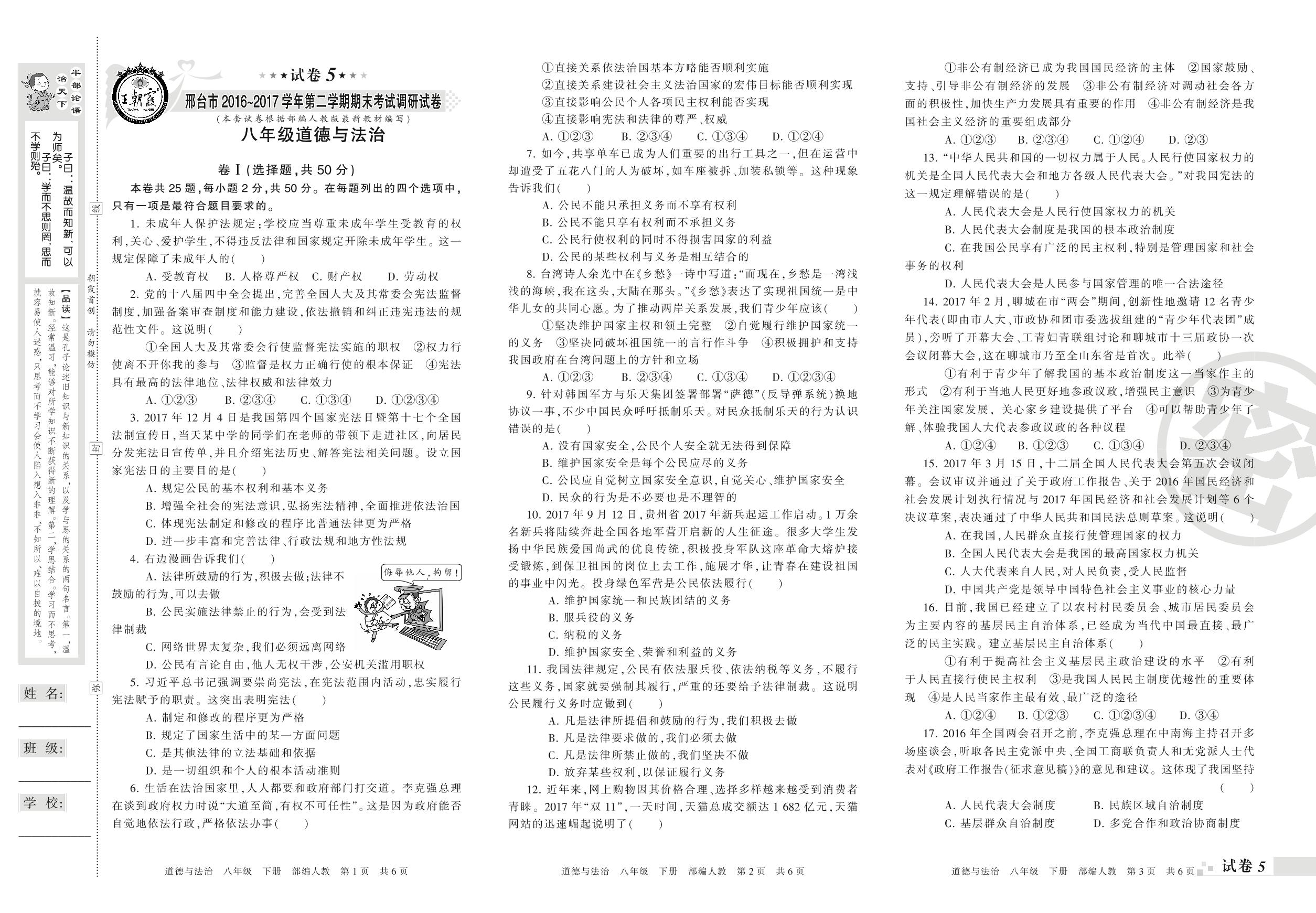2016-2017学年第二学期邢台市八年级道德与法治试卷(人教版)【5】