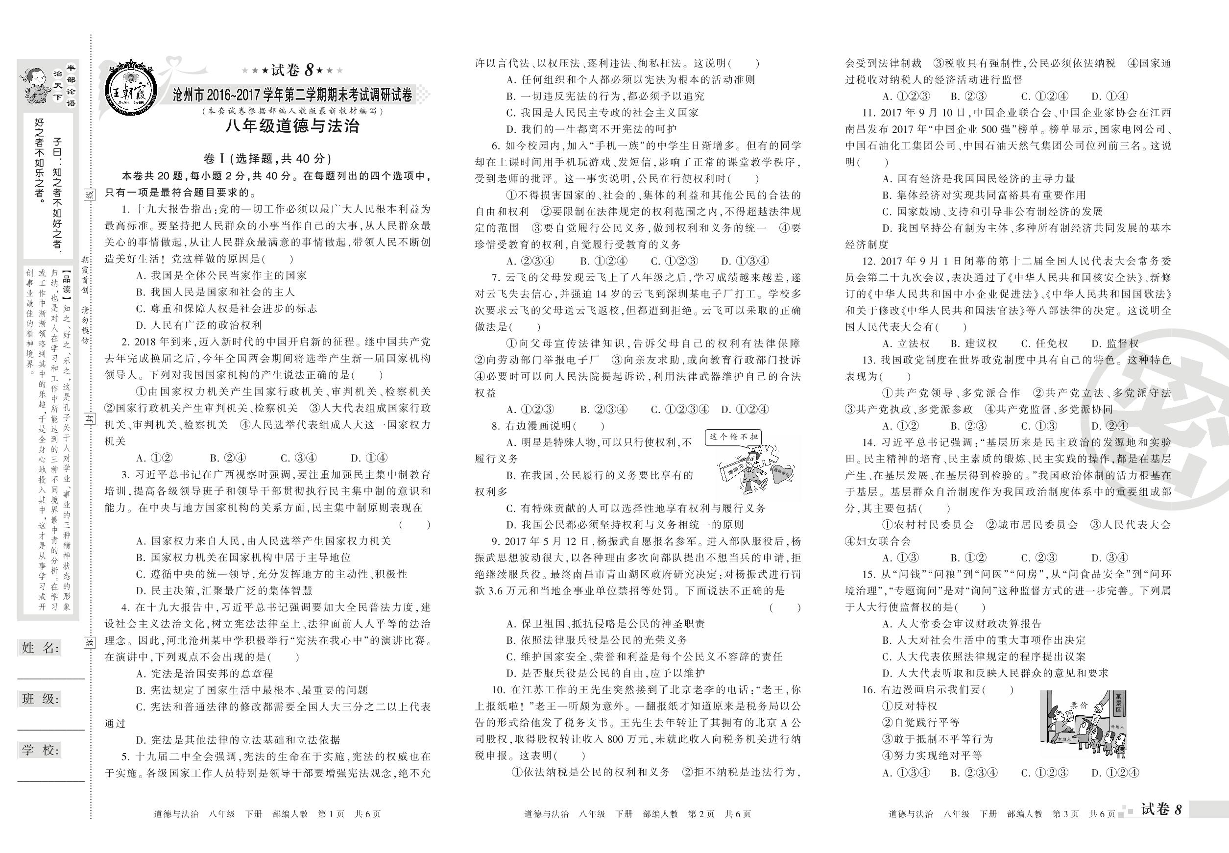 2016-2017学年第二学期沧州市八年级道德与法治试卷(人教版)【8】
