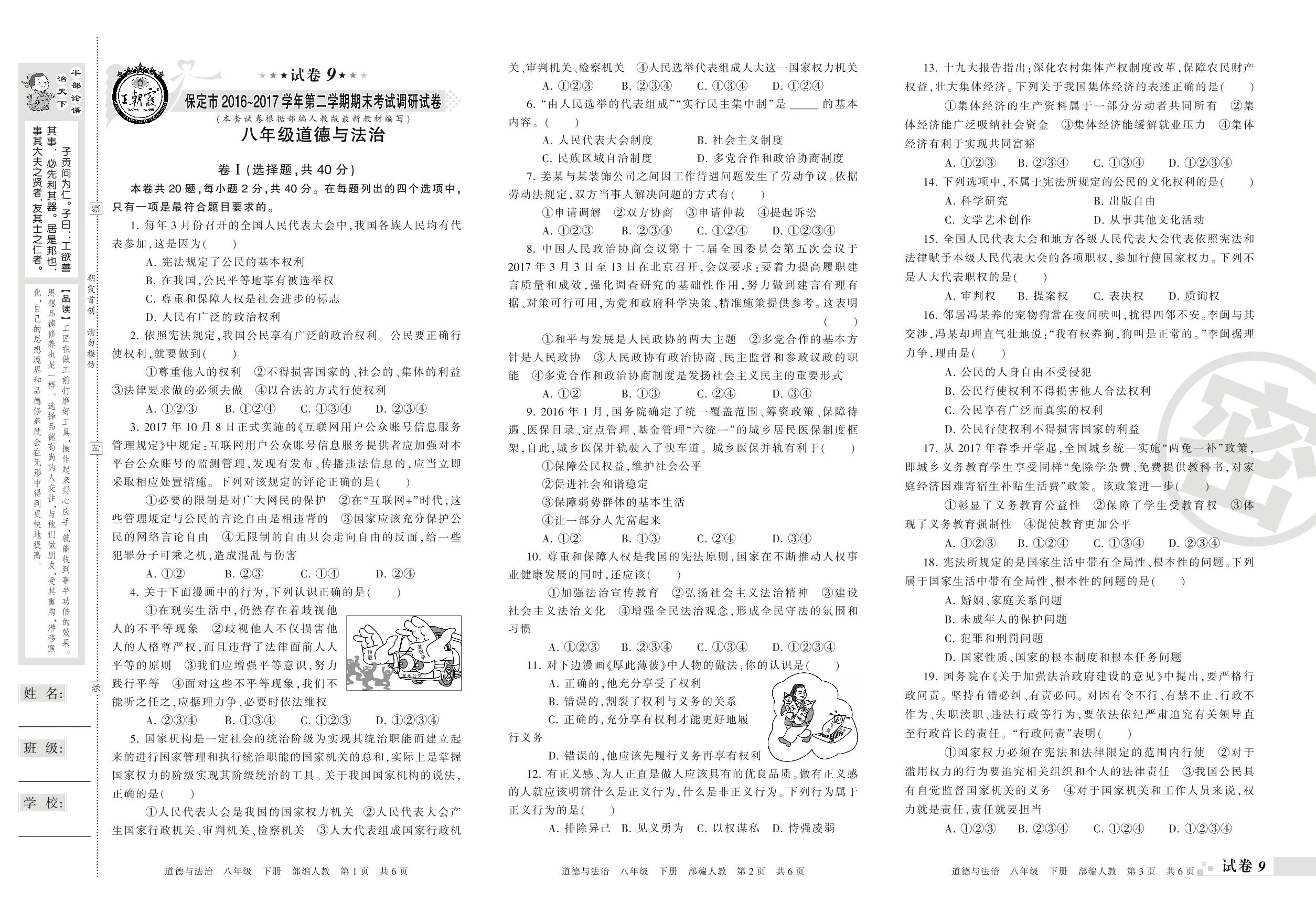 2016-2017学年第二学期保定市八年级道德与法治试卷(人教版)【9】
