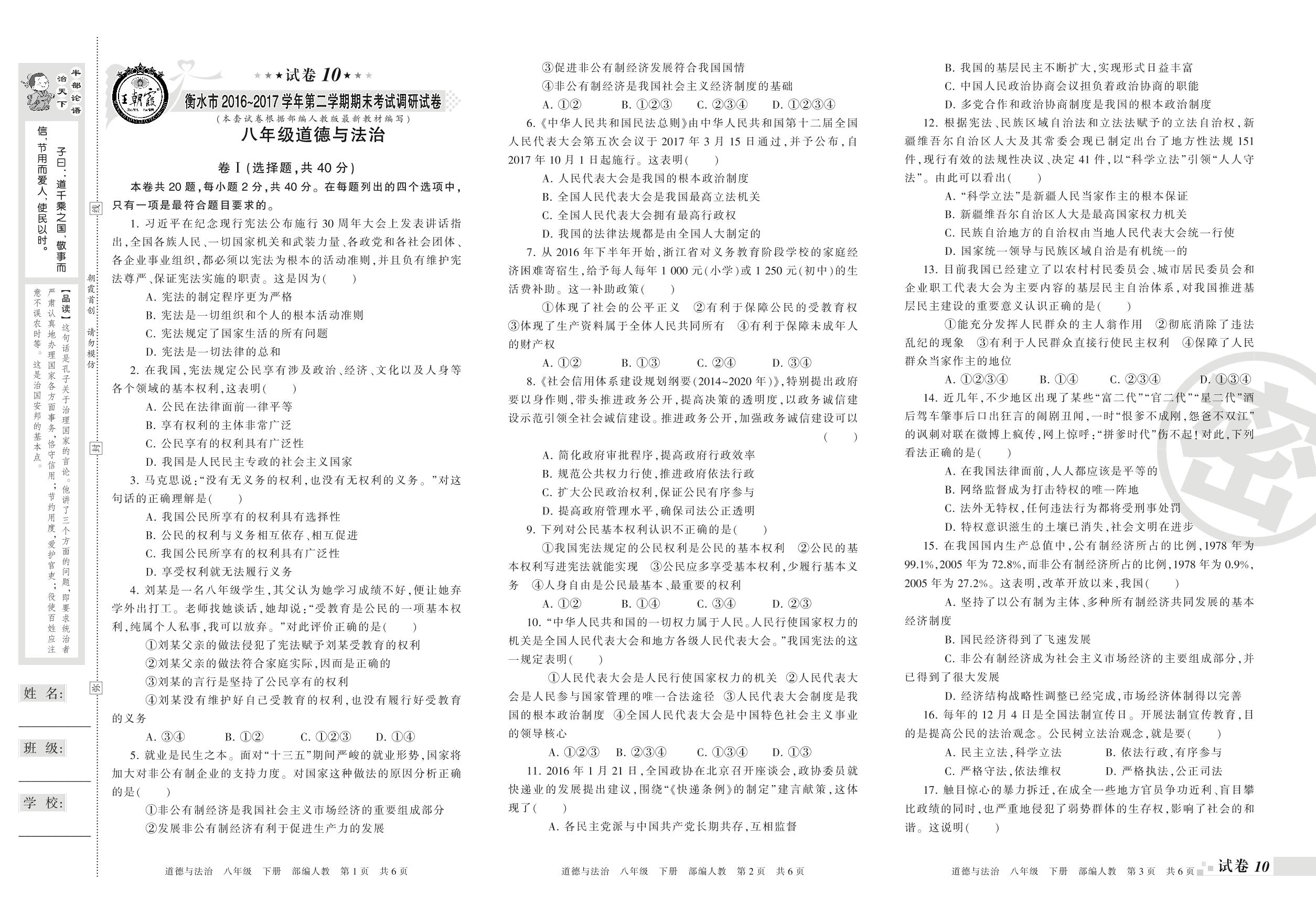 2016-2017学年第二学期衡水市八年级道德与法治试卷(人教版)【10】