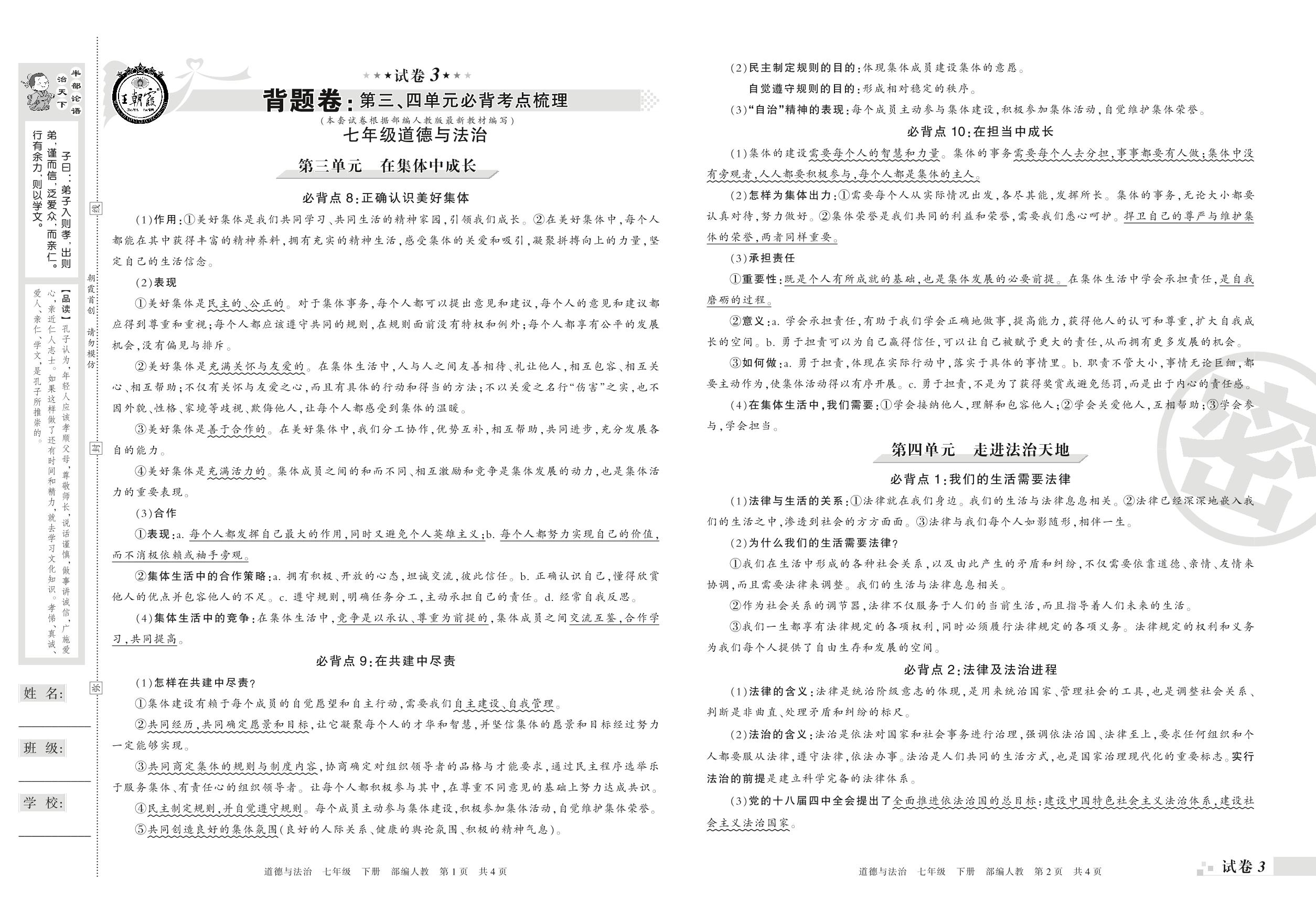 王朝霞期末背题卷——第三、四单元必背考点梳理七年级下册道德与法治(人教版)_R210812154427【3】