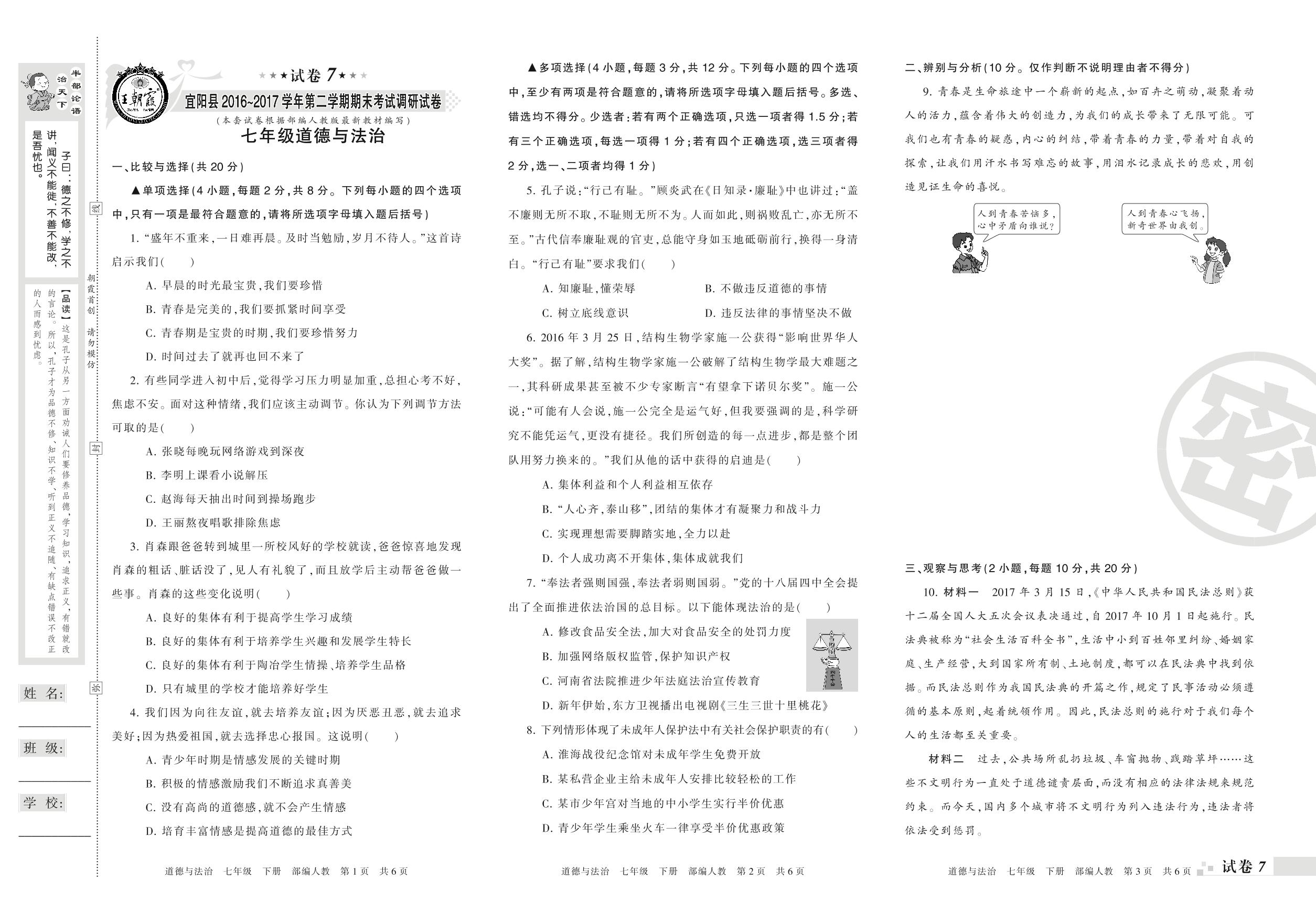 2016-2017学年第二学期洛阳市宜阳县七年级道德与法治试卷(人教版)【7】