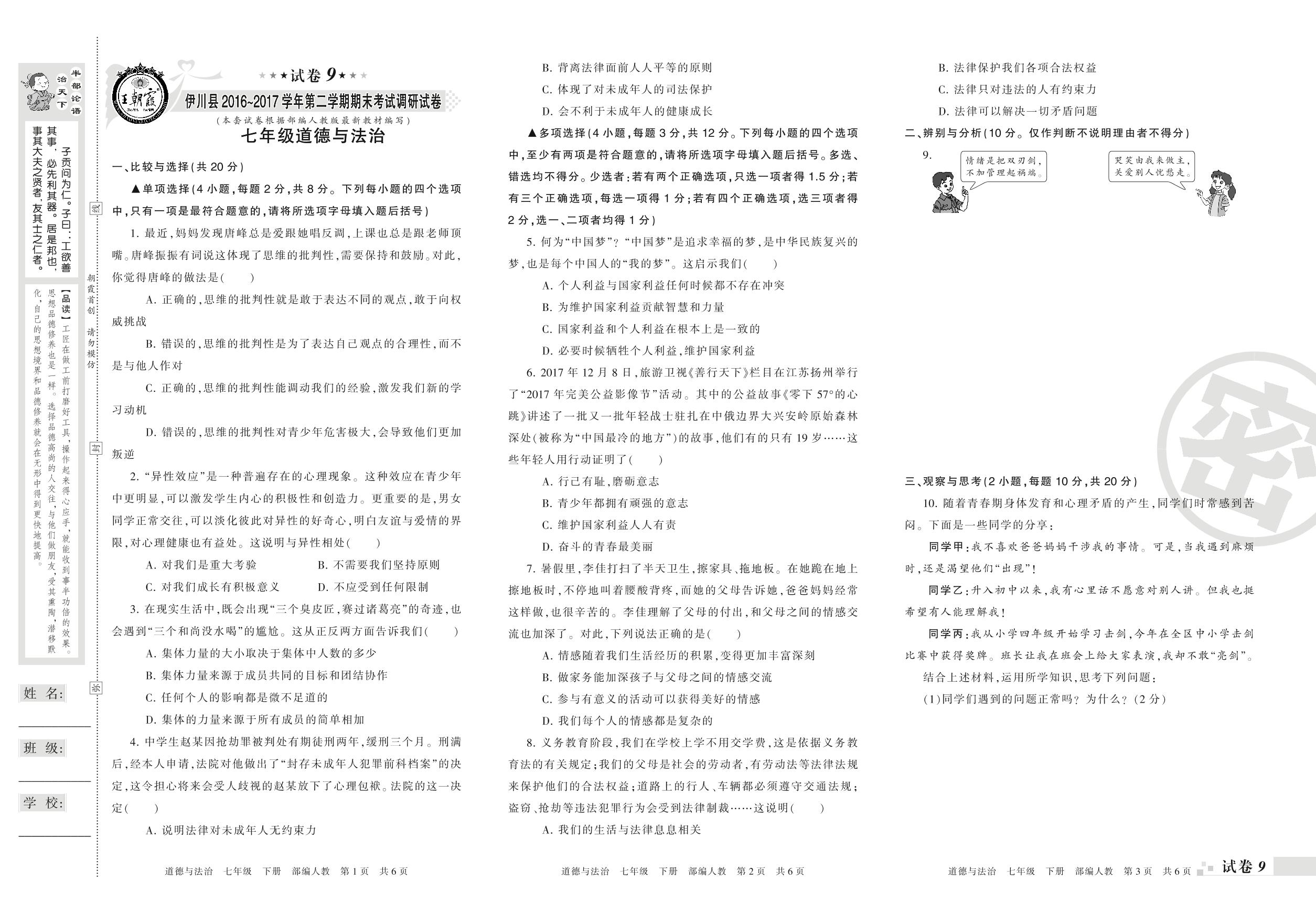 2016-2017学年第二学期洛阳市伊川县七年级道德与法治试卷(人教版)【9】