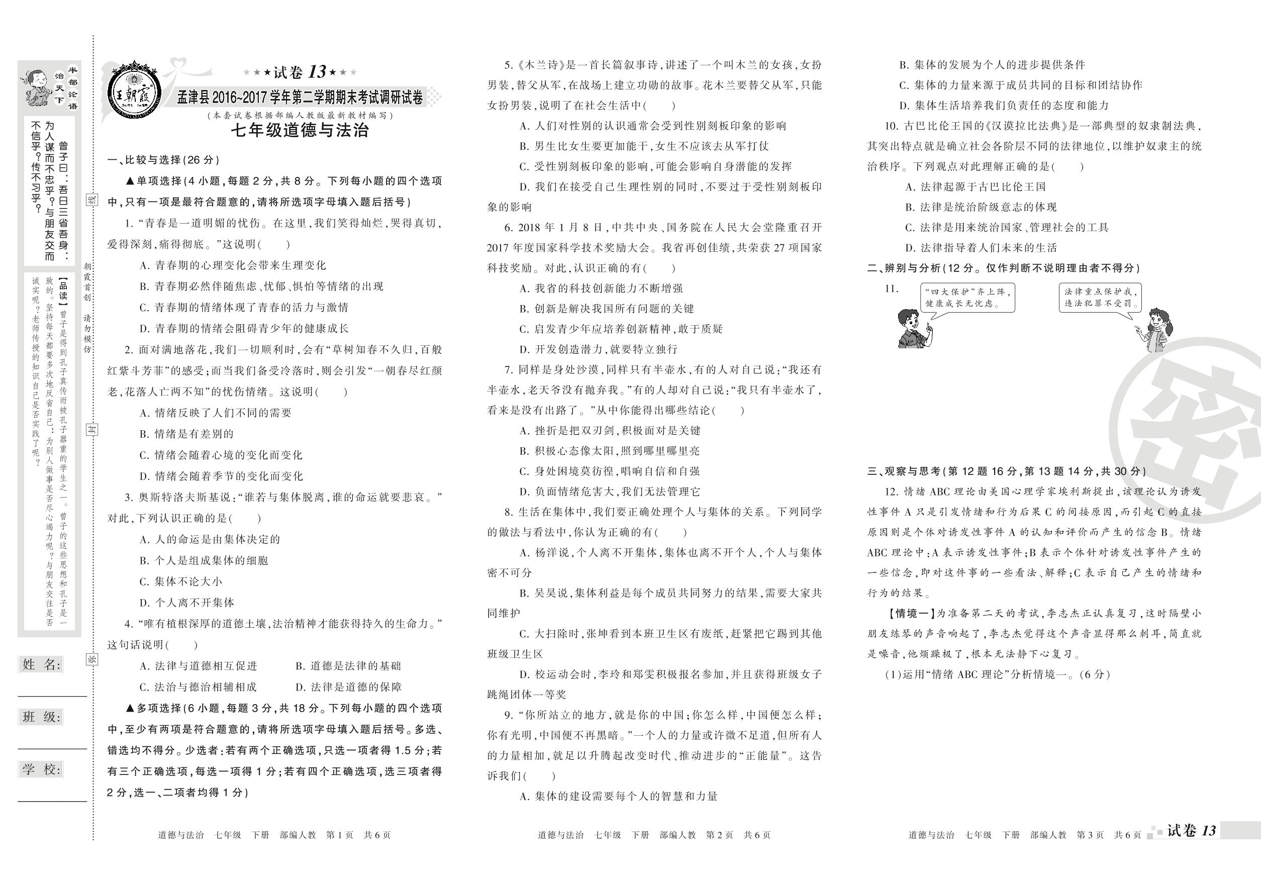 2016-2017学年第二学期洛阳市孟津县七年级道德与法治试卷(人教版)【13】