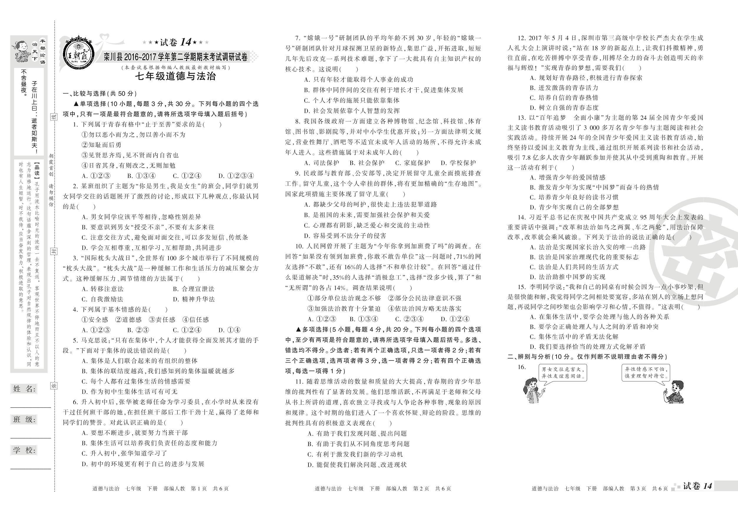 2016-2017学年第二学期洛阳市栾川县七年级道德与法治试卷(人教版)【14】