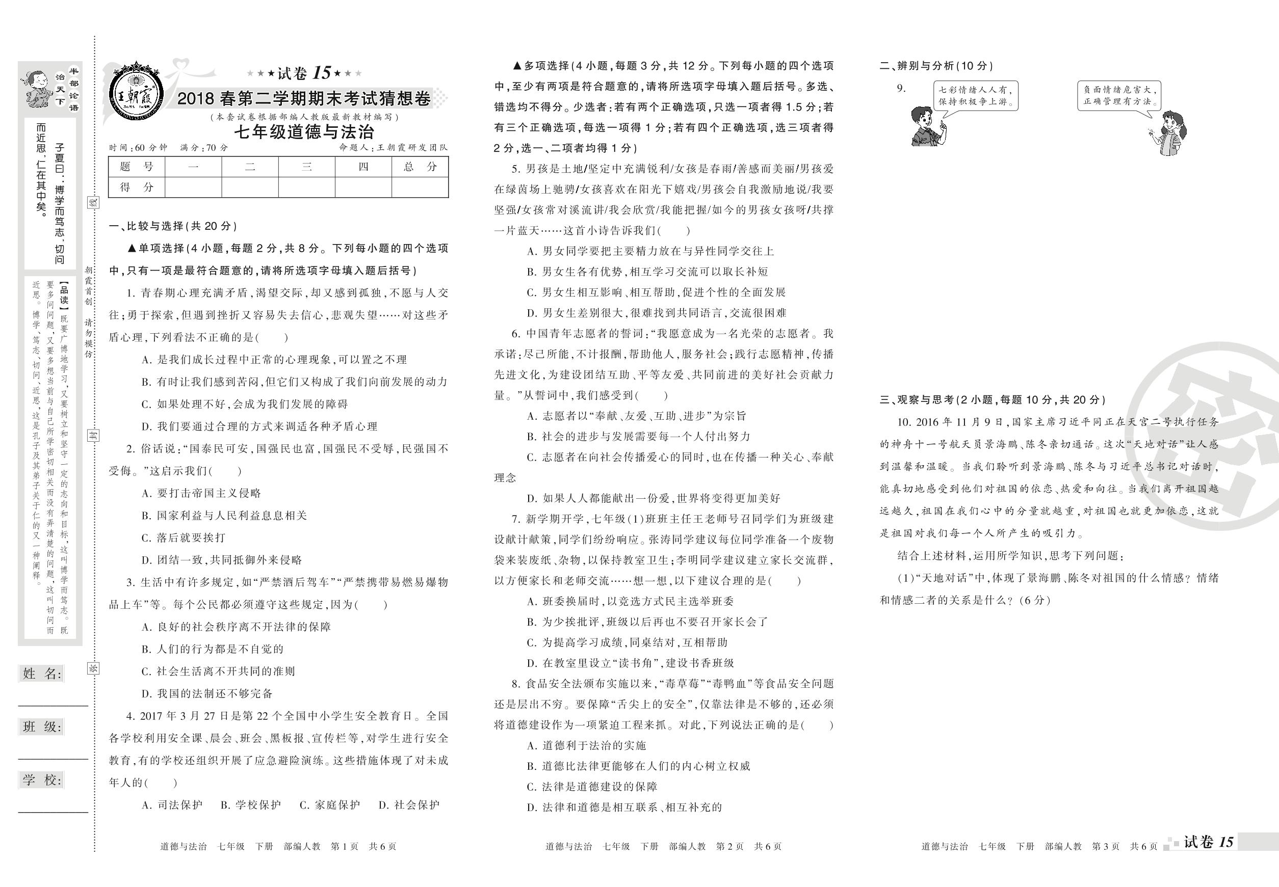 2017-2018学年第二学期期末考试猜想卷七年级道德与法治(人教版)【15】