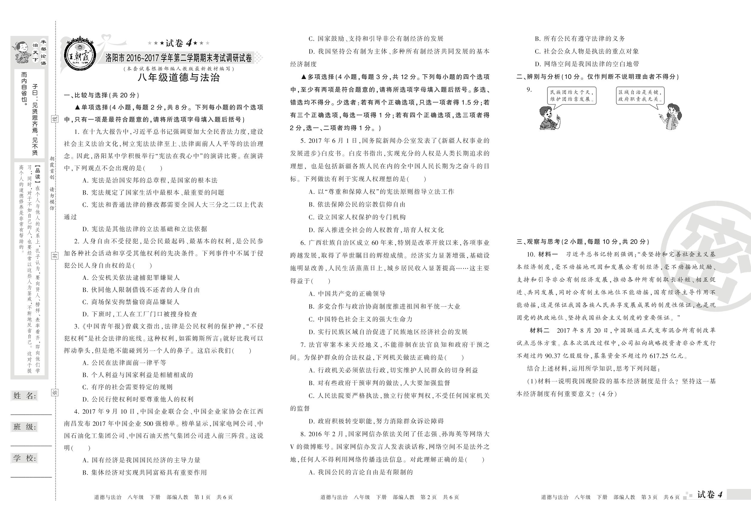 2016-2017学年第二学期洛阳市八年级道德与法治试卷(人教版)【4】