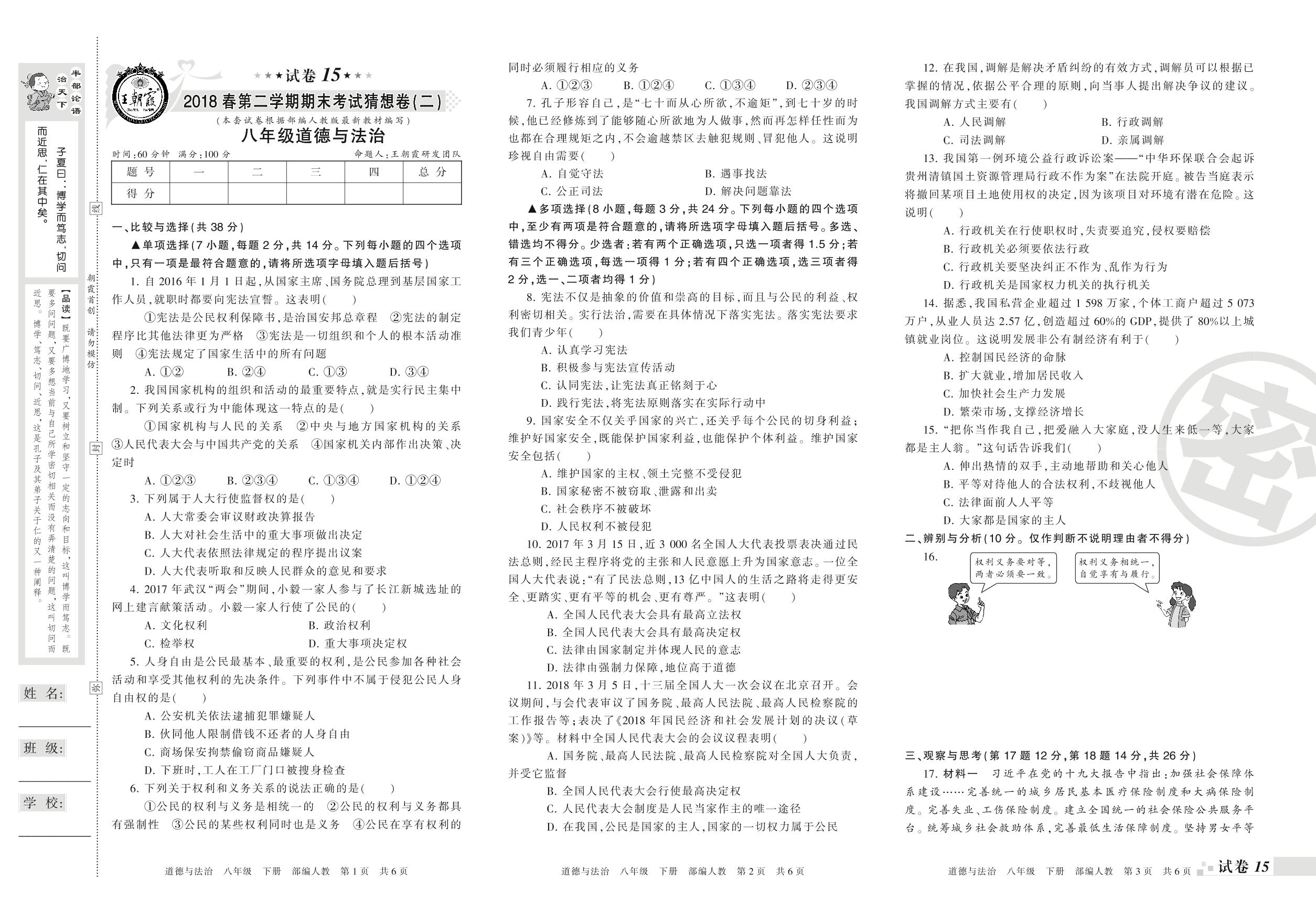 2017-2018学年第二学期期末考试猜想卷(二)八年级下册道德与法治(人教版)【15】