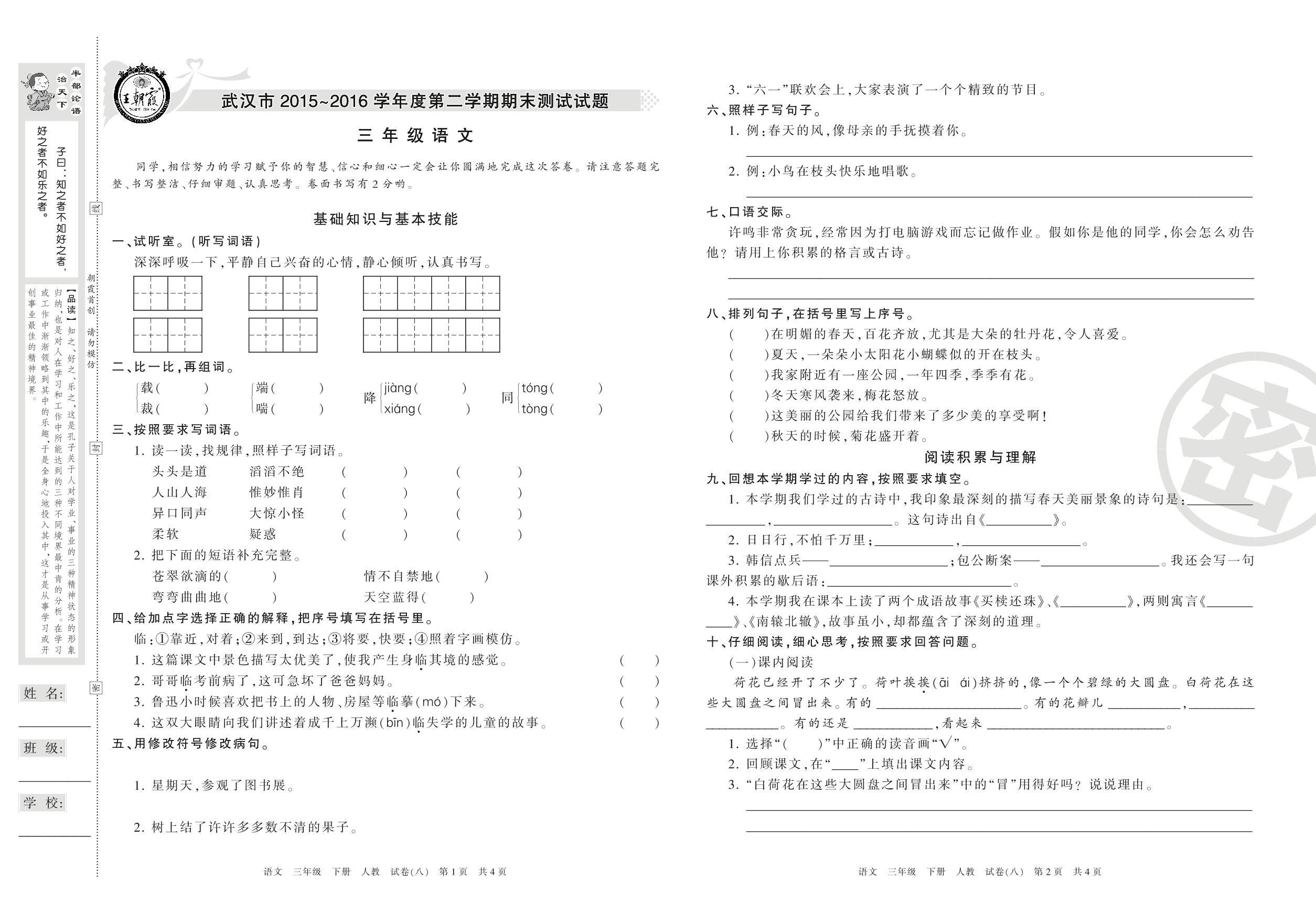 2015-2016学年第二学期武汉市三年级语文试卷(人教版)【8】