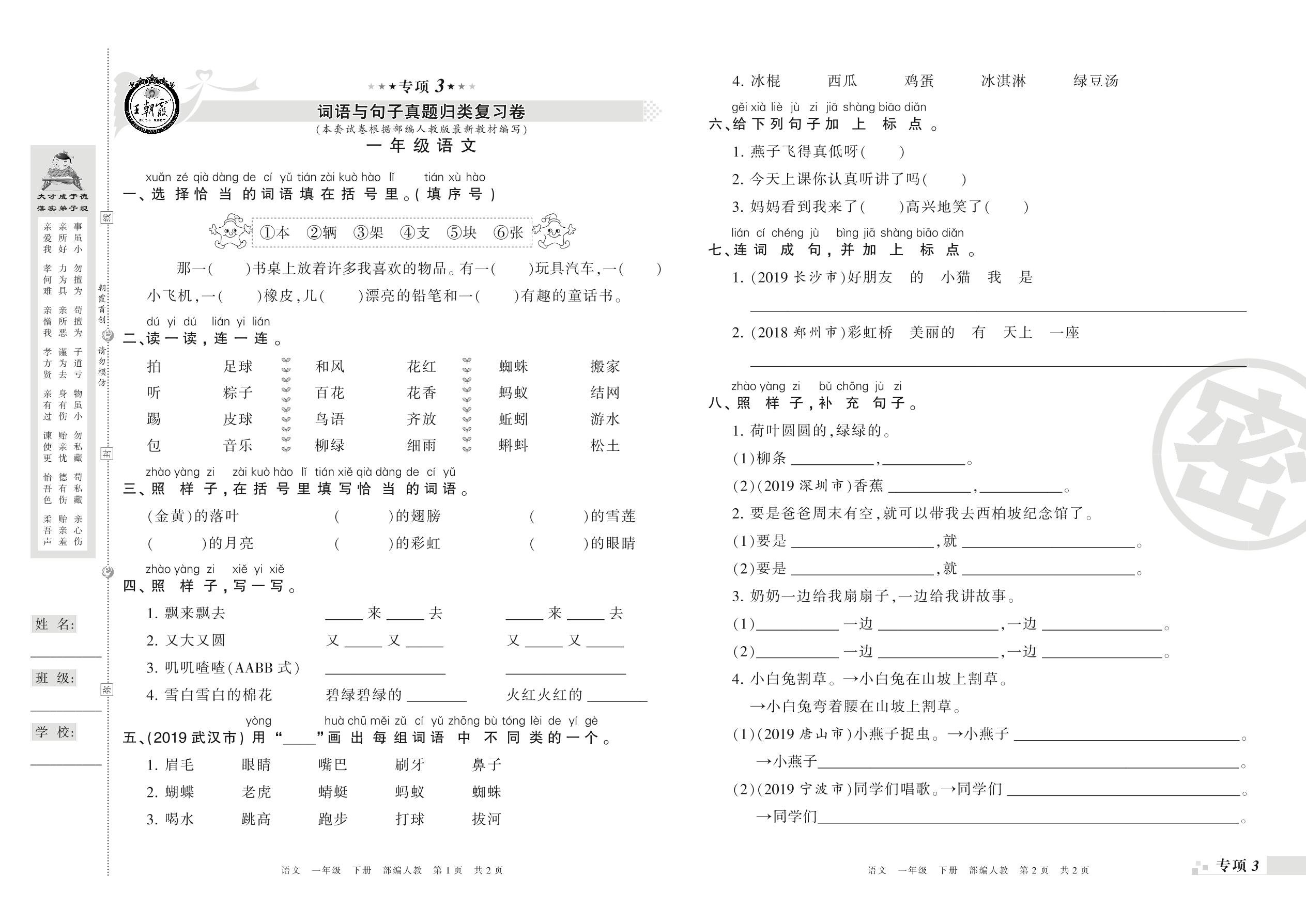 王朝霞期末专项卷——词语与句子、课文内容与积累运用真题归类复习卷一年级下册语文(人教版)_R210731180202【0】
