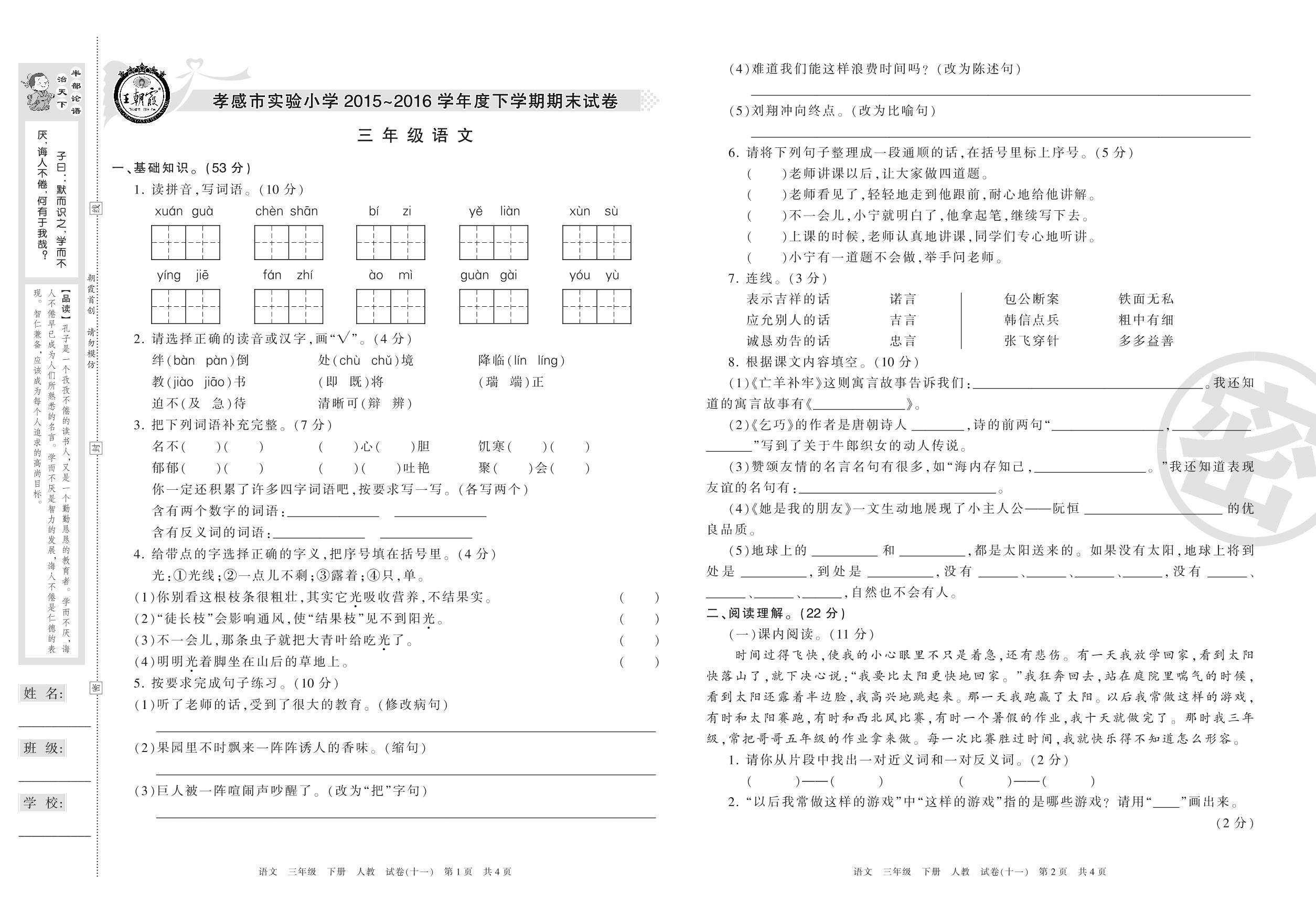 2015-2016学年第二学期孝感市三年级语文试卷(人教版)【11】