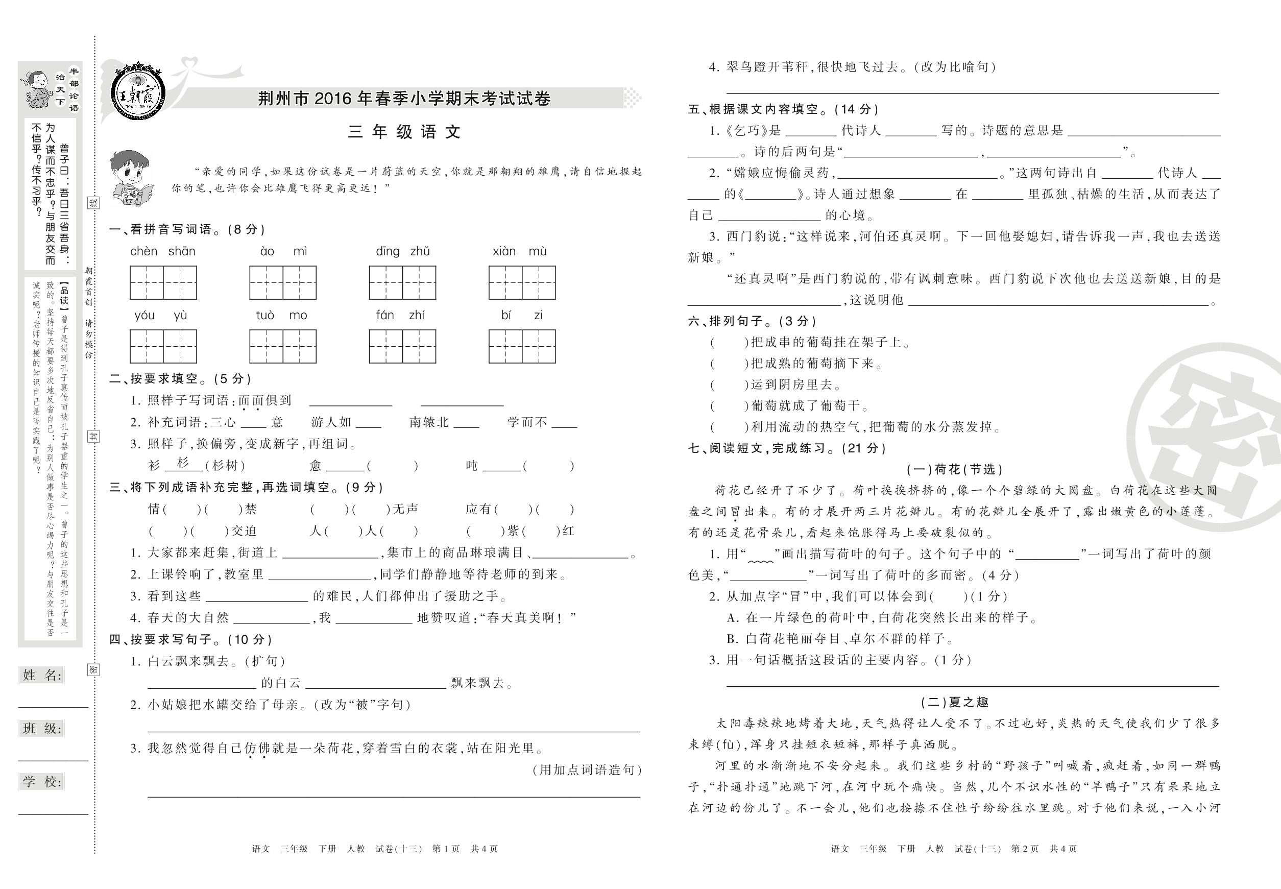 2015-2016学年第二学期荆州市三年级语文试卷(人教版)【13】