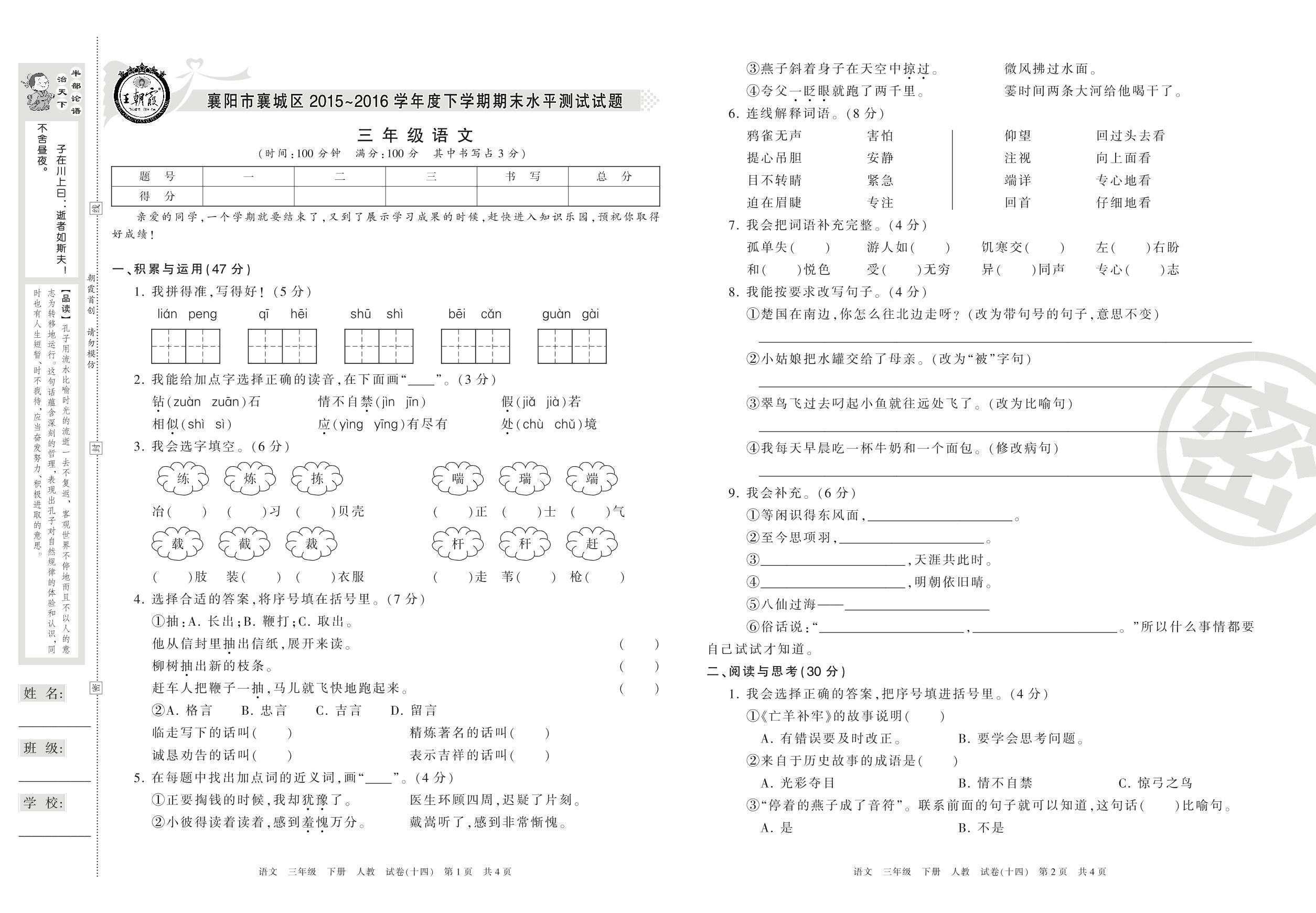 2015-2016学年第二学期襄阳市襄城区三年级语文试卷(人教版)【14】