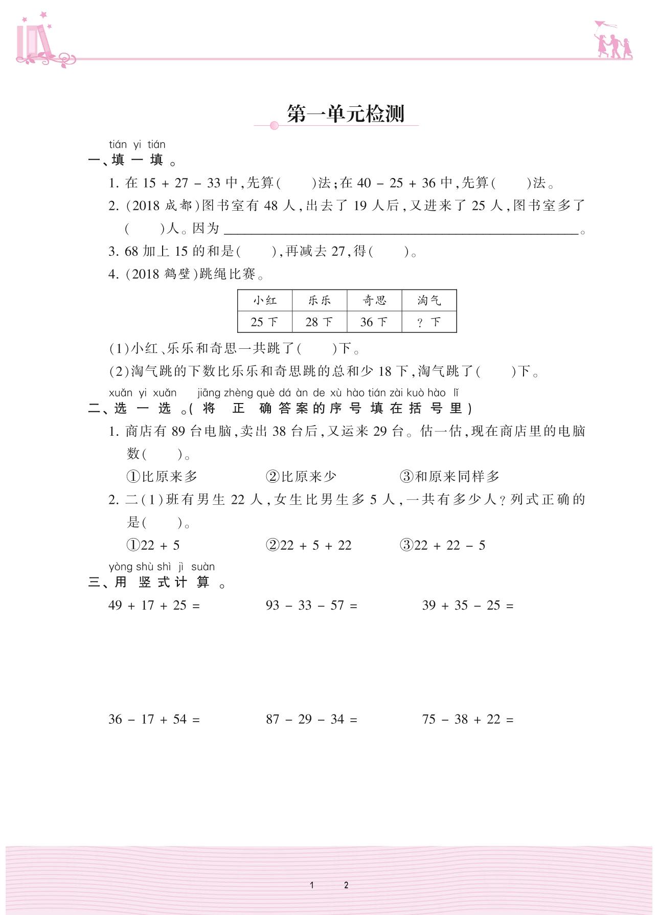 2020上册二年级数学北师版 一 加与减——第一单元检测