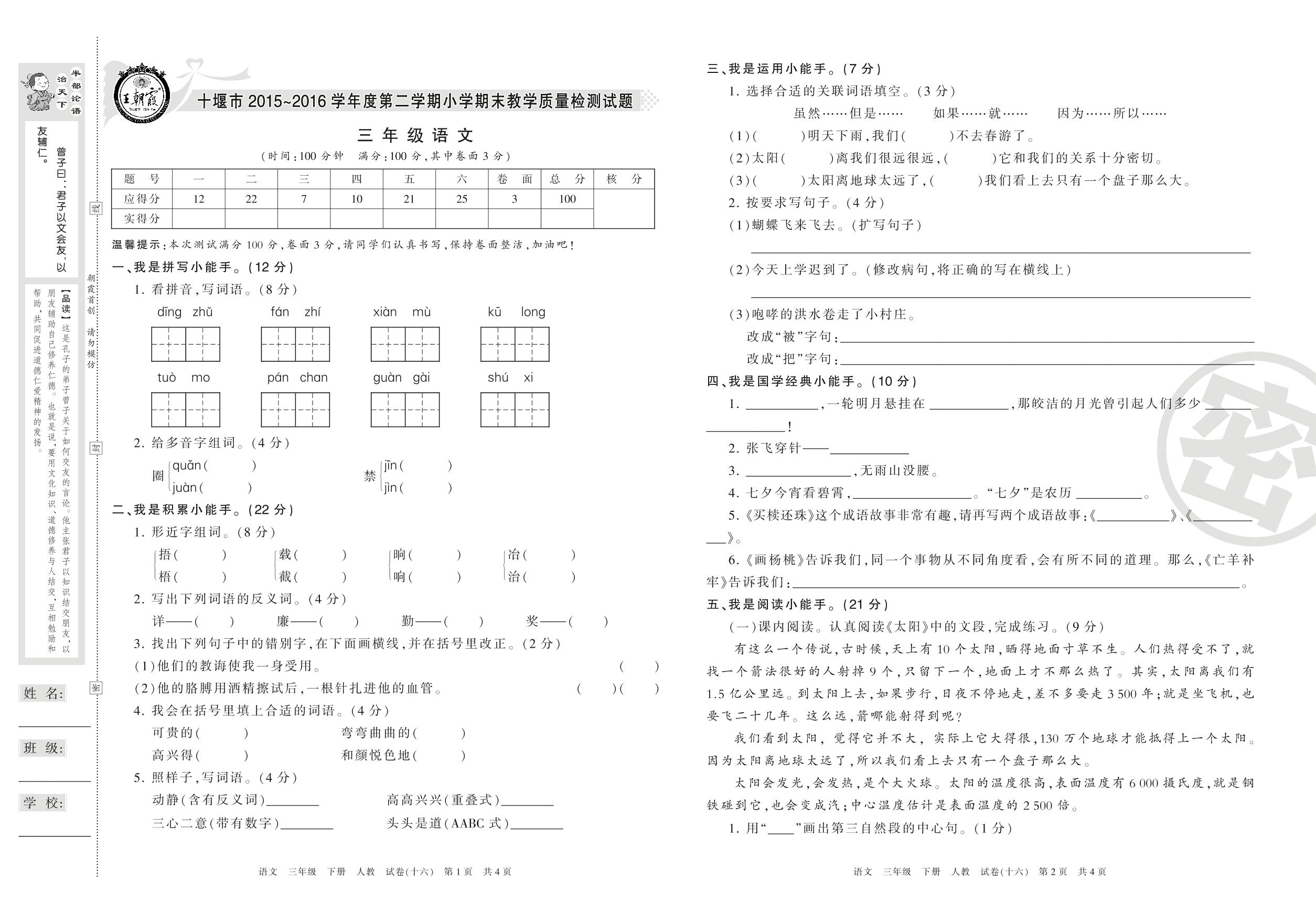 2015-2016学年第二学期十堰市三年级语文试卷(人教版)【16】