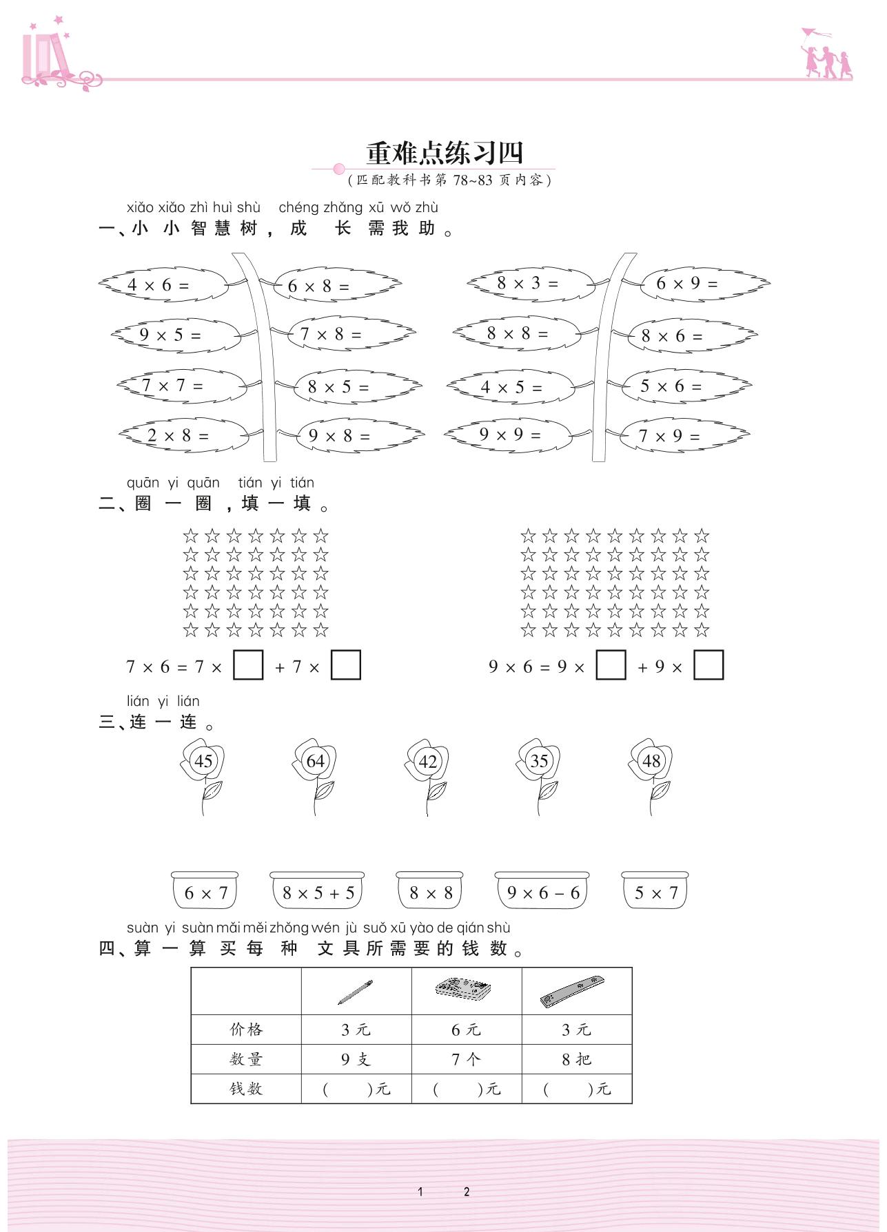 2020上册二年级数学北师版 八 6~12的乘法口诀——重难点练习四
