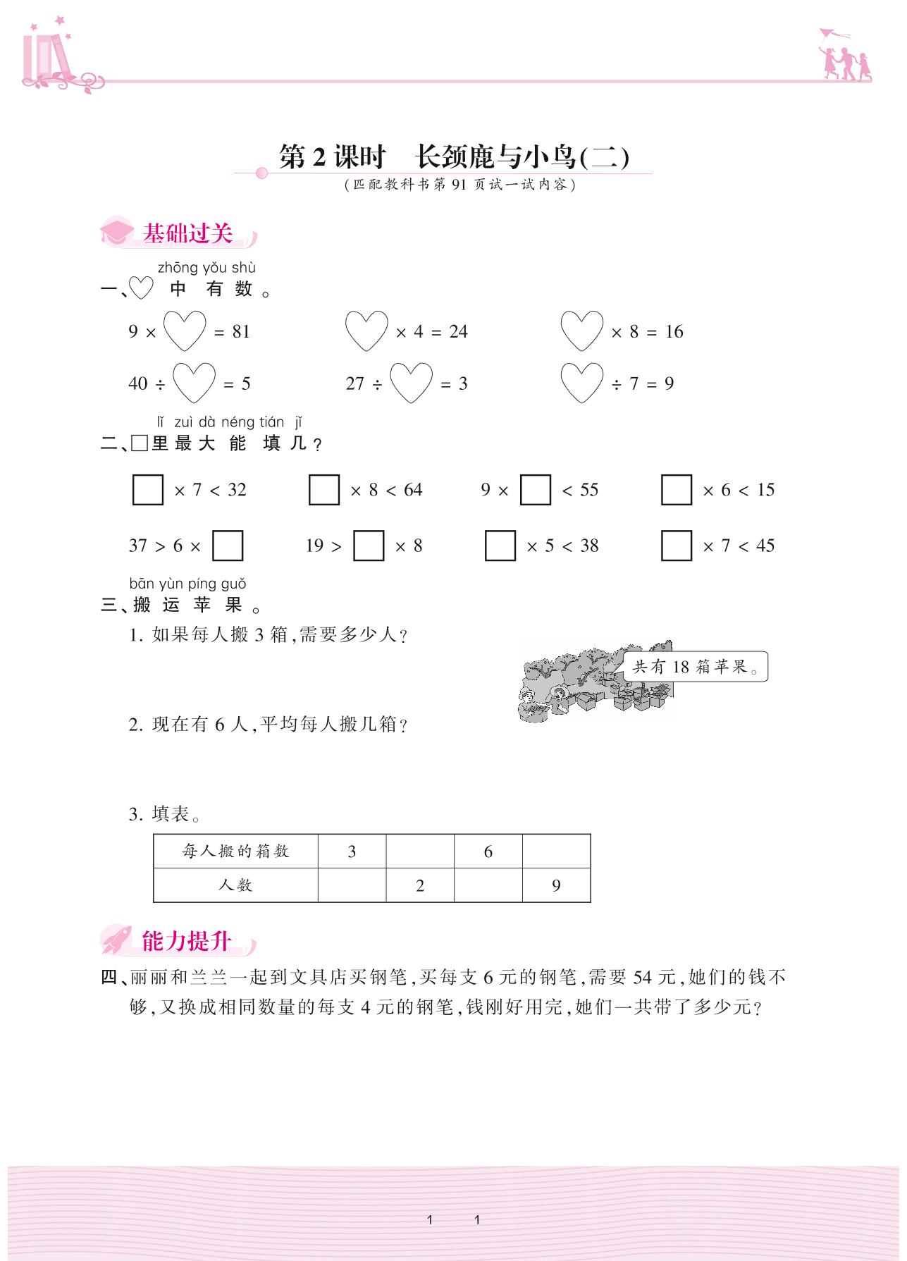 2020上册二年级数学北师版 九 除法——第2课时 长颈鹿与小鸟(二)