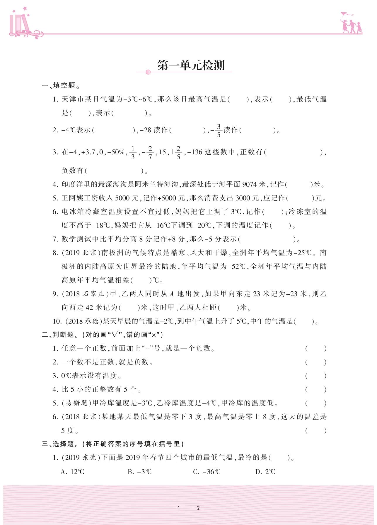 2021下册六年级数学冀教版 一 生活中的负数——第一单元检测