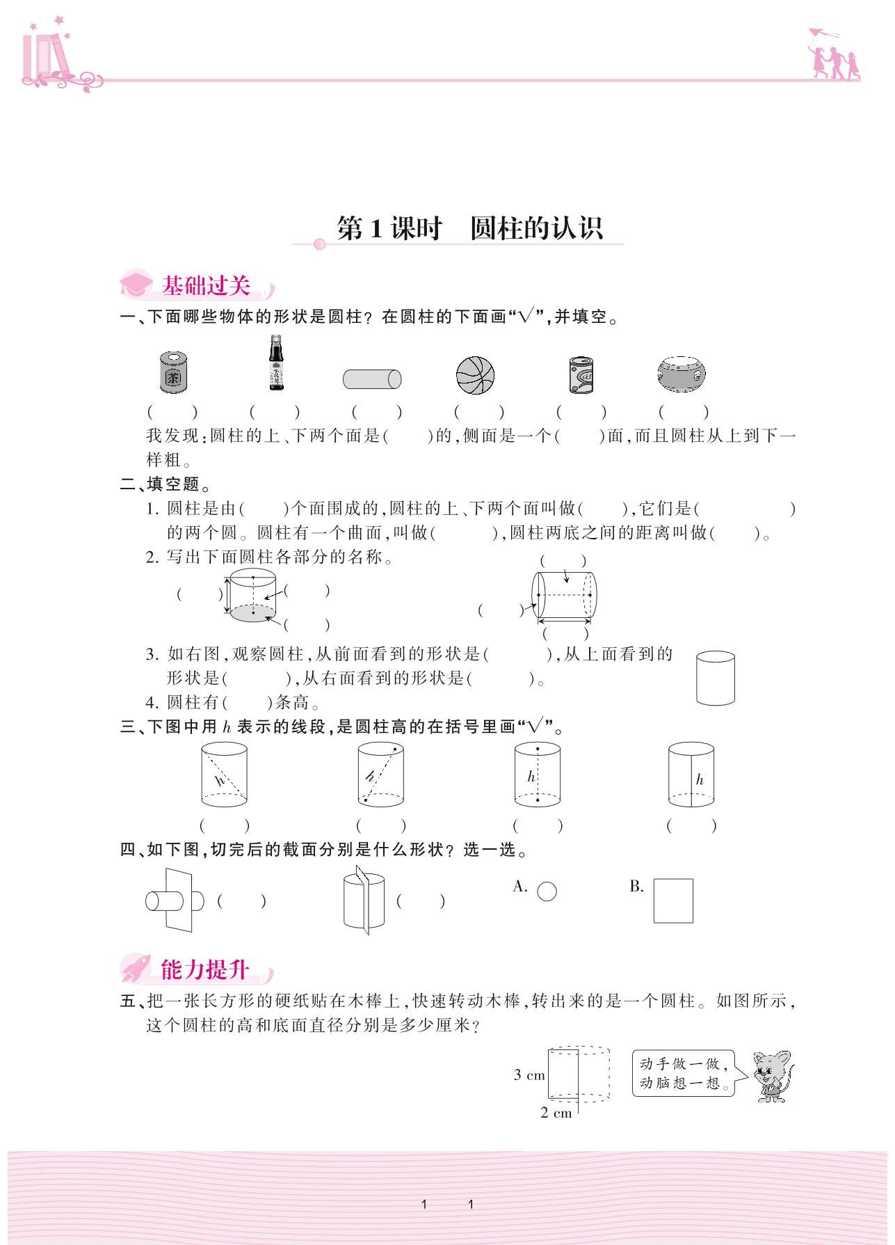 2021下册六年级数学冀教版 四 圆柱和圆锥 1. 圆柱的表面积——第1课时 圆柱的认识