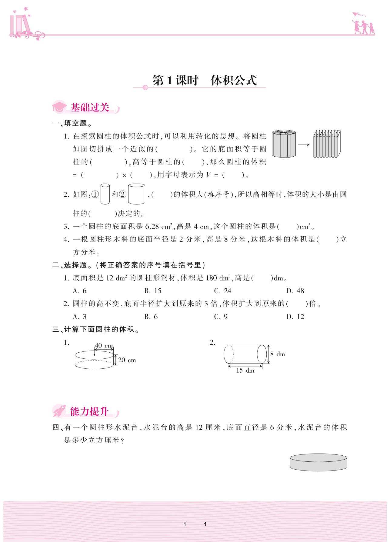 2021下册六年级数学冀教版 四 圆柱和圆锥 2. 圆柱的体积——第1课时 体积公式