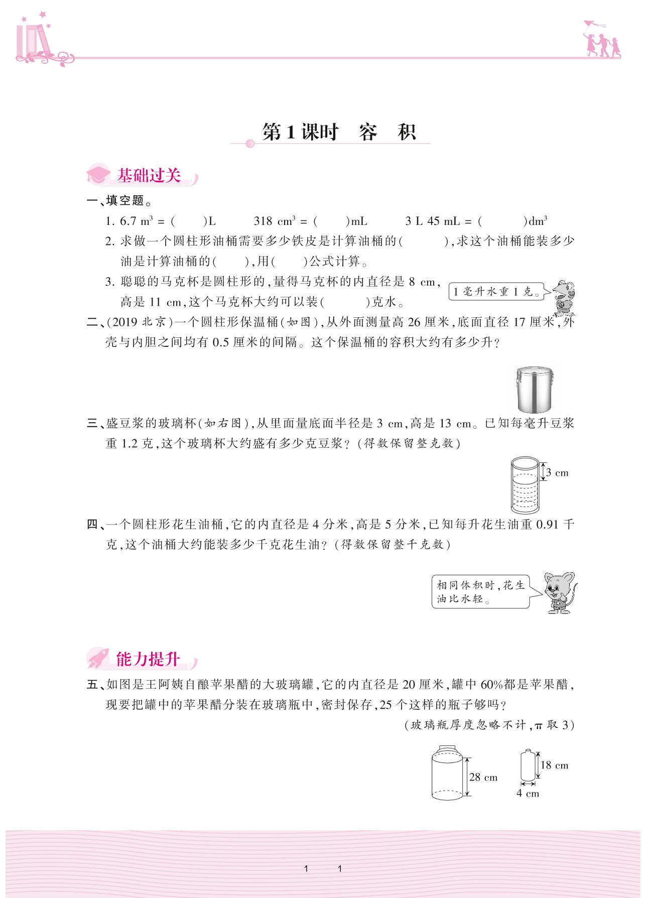 2021下册六年级数学冀教版 四 圆柱和圆锥 3. 容积——第1课时 容积