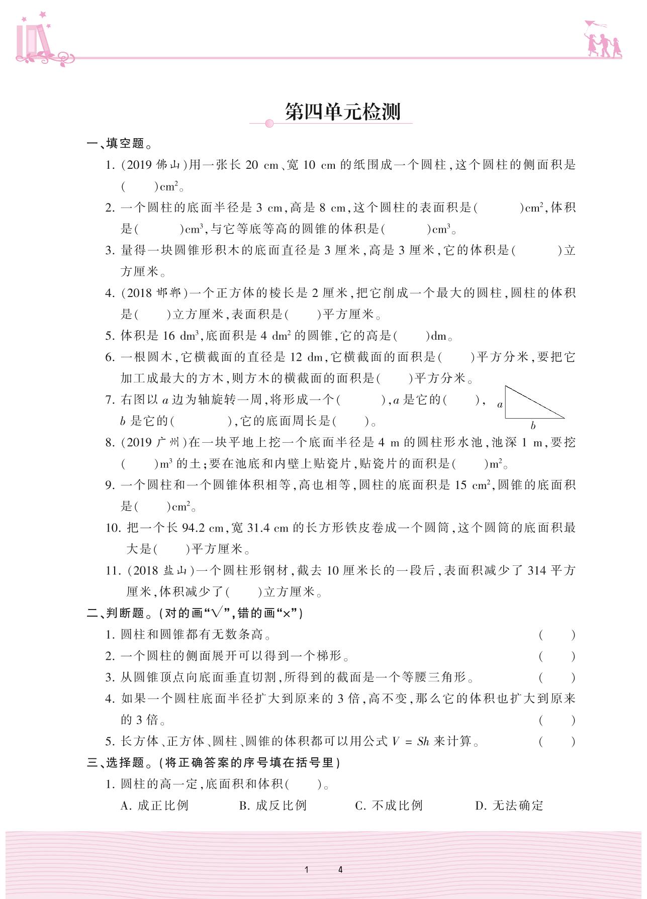 2021下册六年级数学冀教版 四 圆柱和圆锥 4. 圆锥——第四单元检测