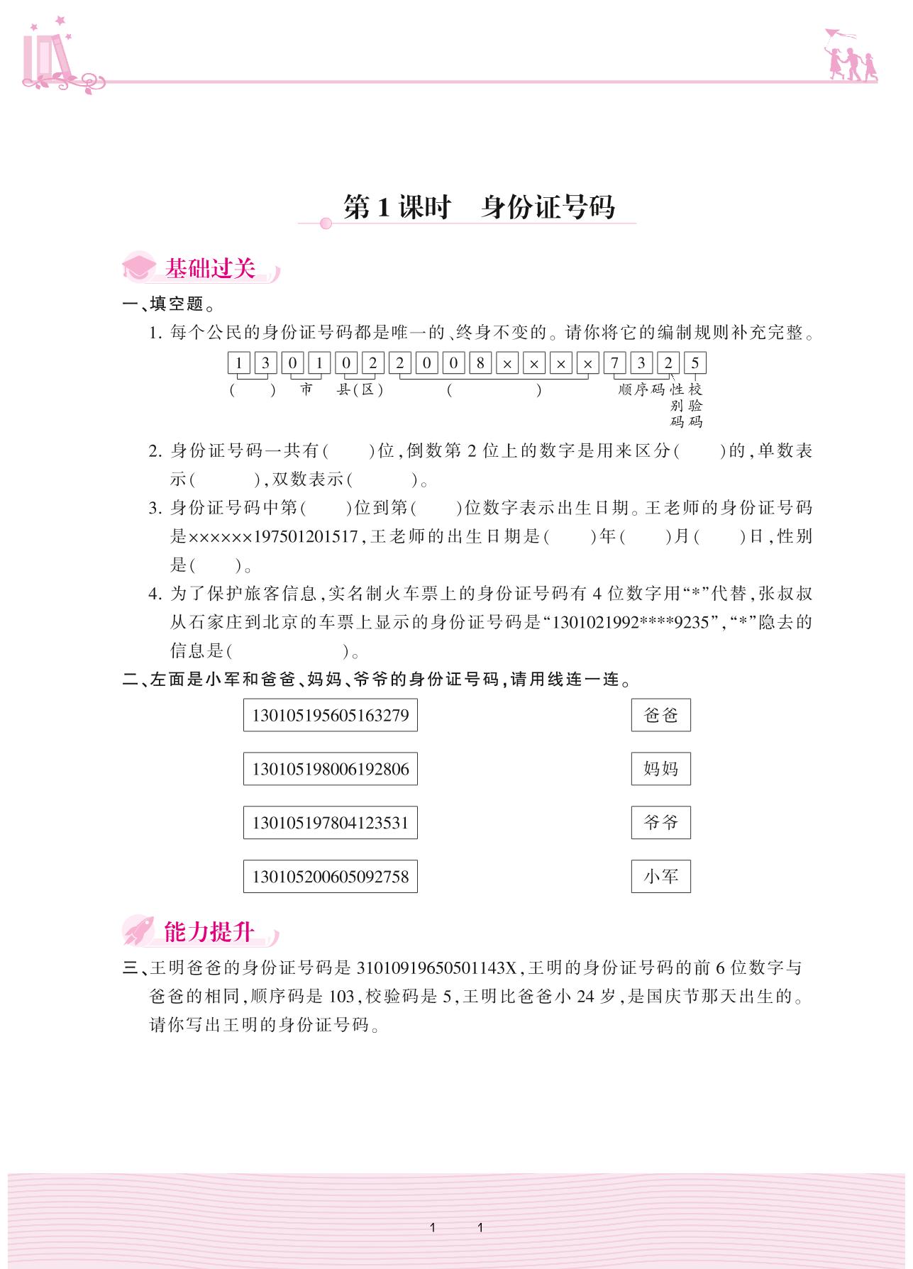 2021下册六年级数学冀教版 五 探索乐园——第1课时 身份证号码