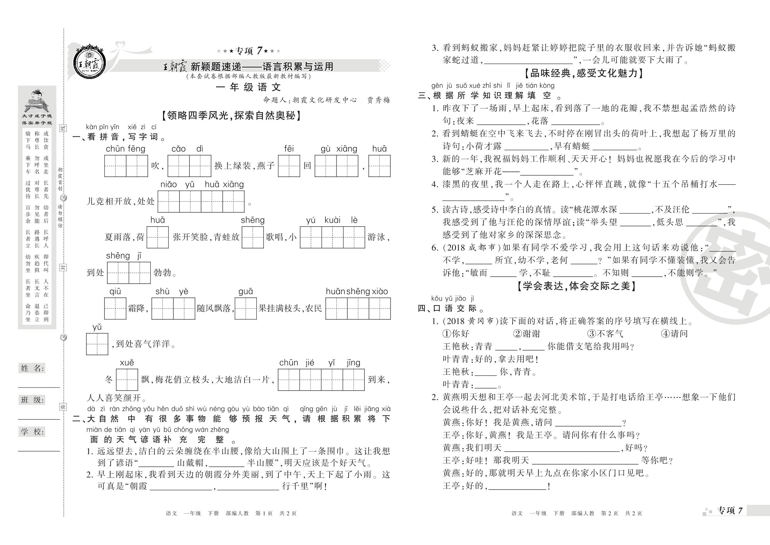王朝霞期末专项卷——新颖题速递:语言积累与运用、非连续性文本阅读一年级下册语文(人教版)_R210731180209【0】