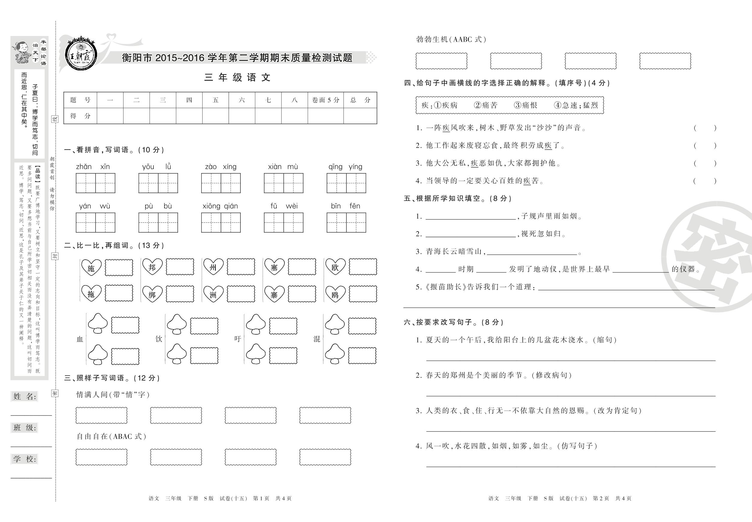 2015-2016学年第二学期衡阳市三年级语文试卷(S版)【15】