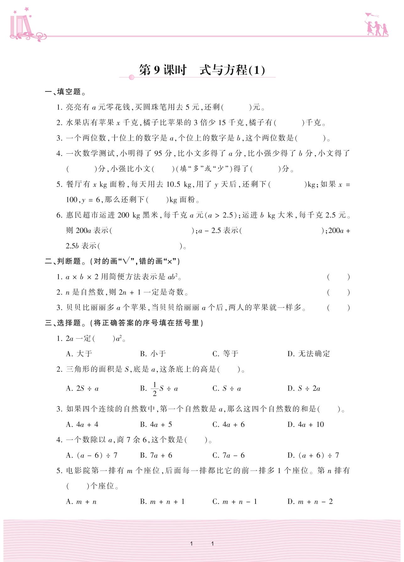 2021下册六年级数学冀教版 六 回顾与整理 (一)数与代数——第9课时 式与方程(1)