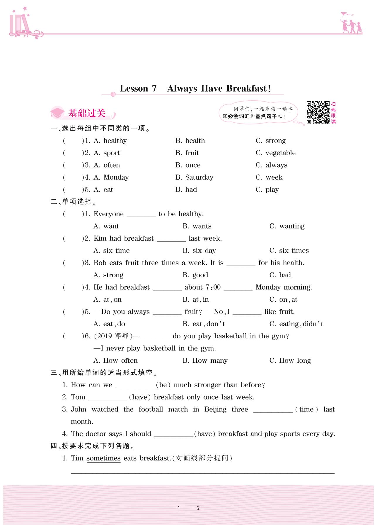 2021下册六年级英语冀教版 Unit 2—Lesson 7 Always Have Breakfast!