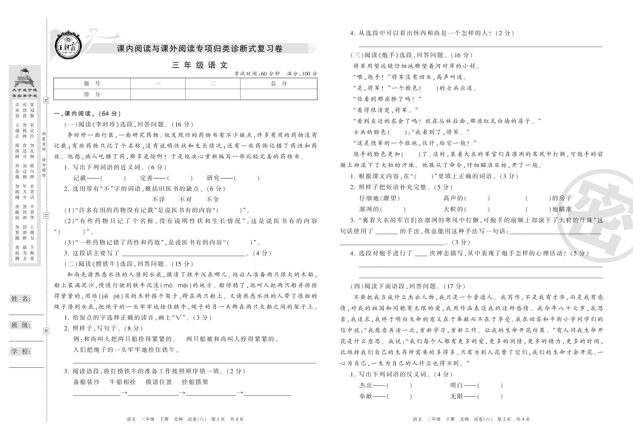 王朝霞期末专项卷三年级下册语文(北师版)_R210801100207【6】