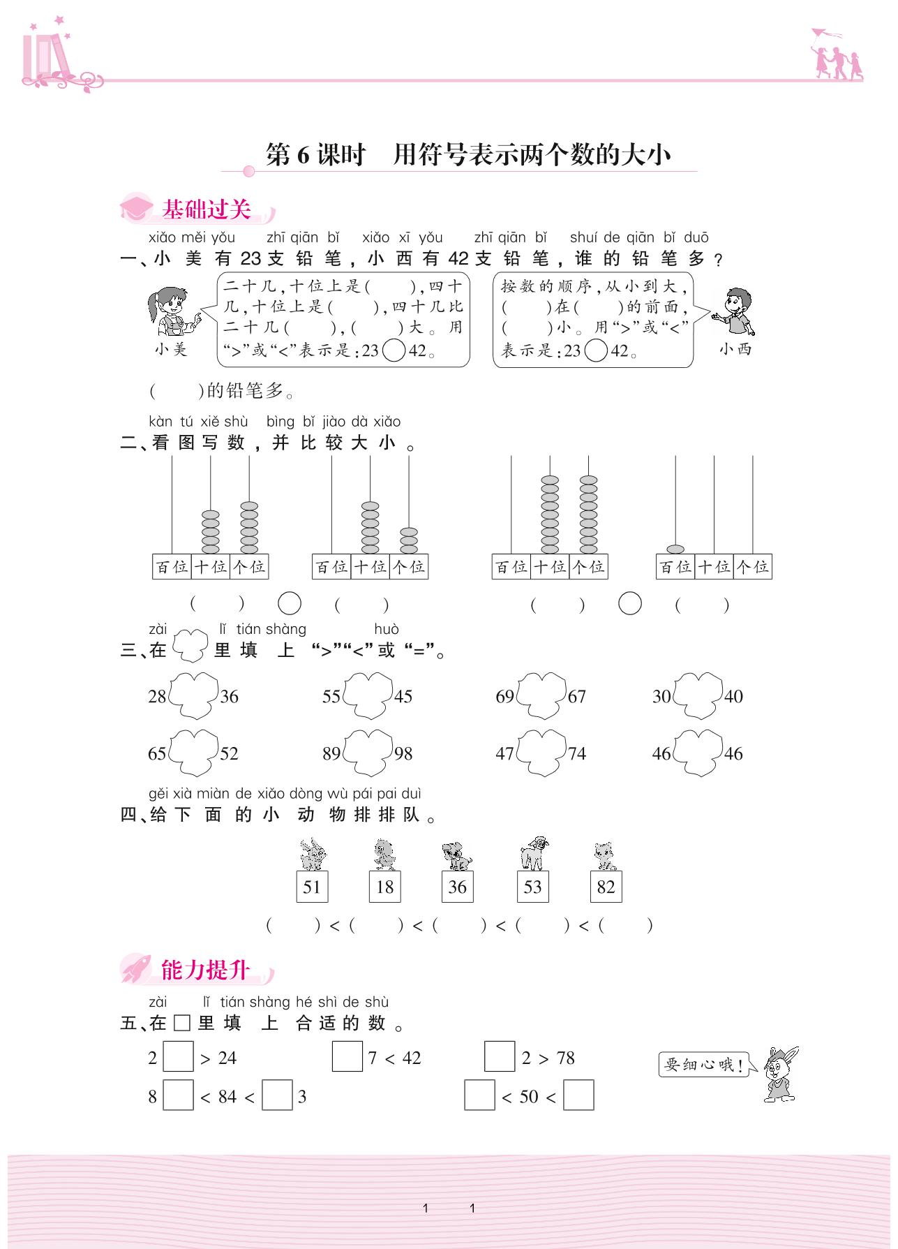 2021下册一年级数学冀教版 三 100以内数的认识——第6课时 用符号表示两个数的大小
