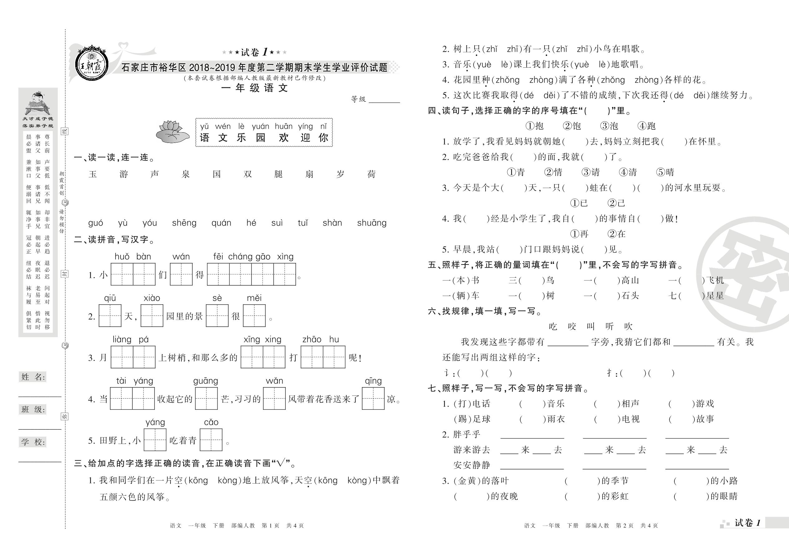 2018-2019学年第二学期石家庄市裕华区一年级语文试卷(人教版)【1】