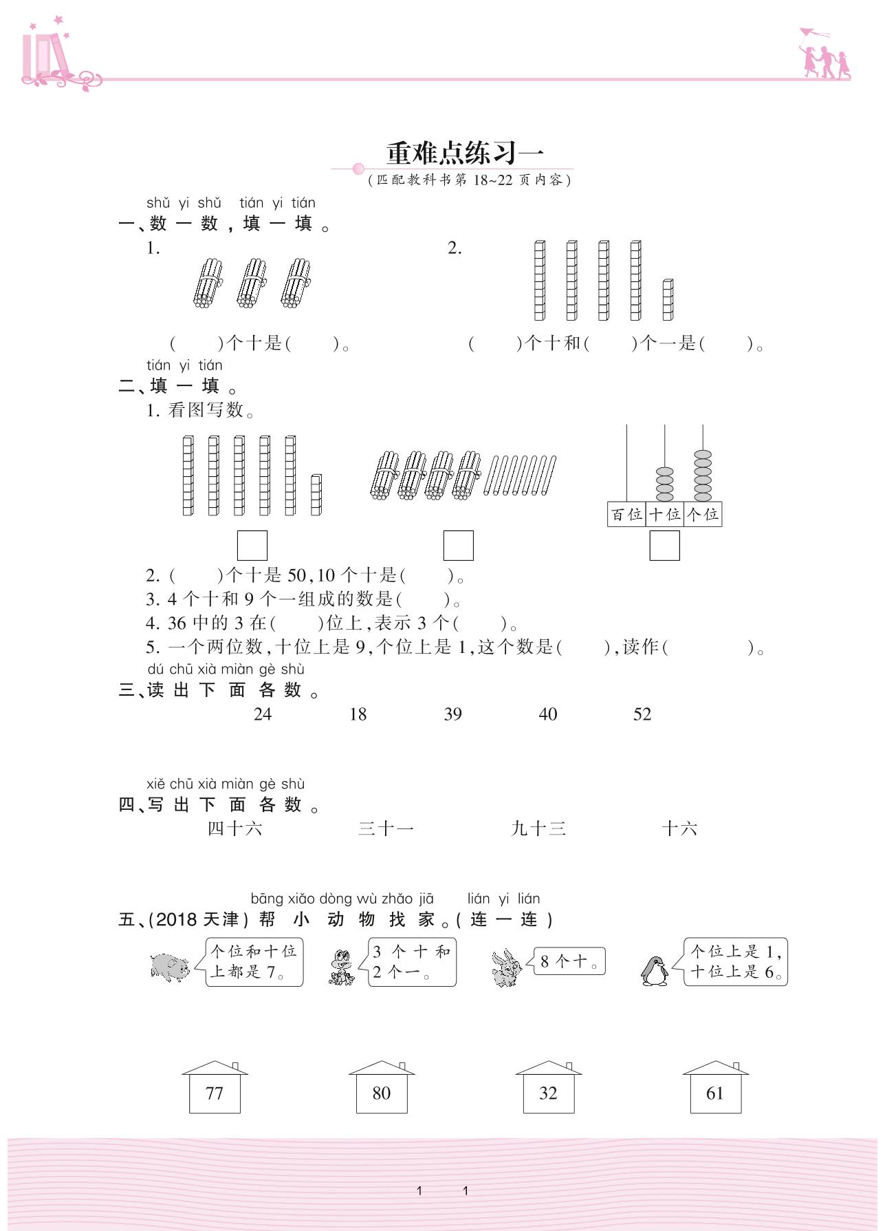 2021下册一年级数学冀教版 三 100以内数的认识——重难点练习一