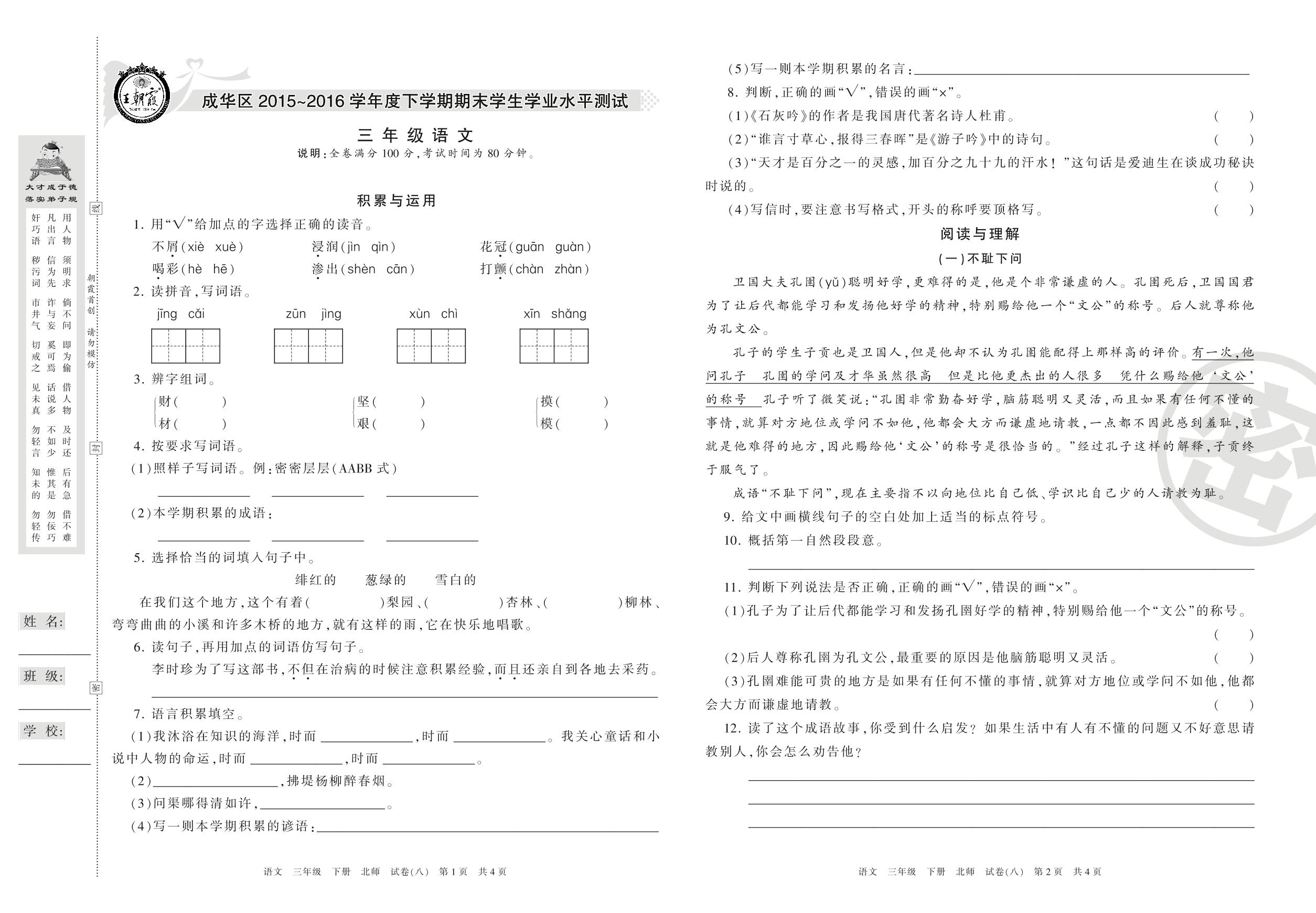 2015-2016学年第二学期成都市成华区三年级语文试卷(北师版)【8】