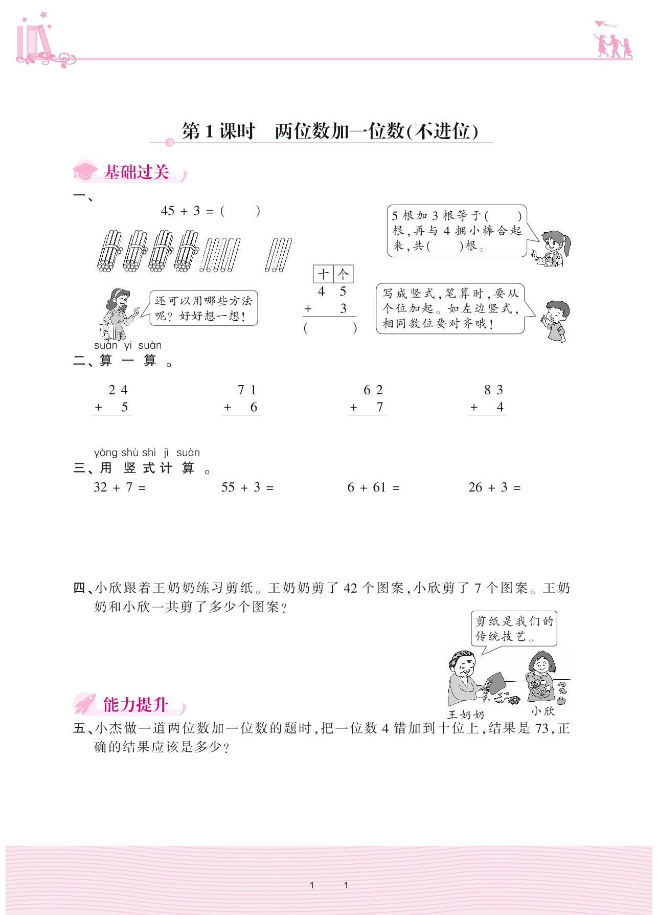 2021下册一年级数学冀教版 五 100以内的加法和减法(一) 3. 两位数加一位数——第1课时 两位数加一位数(不进位)