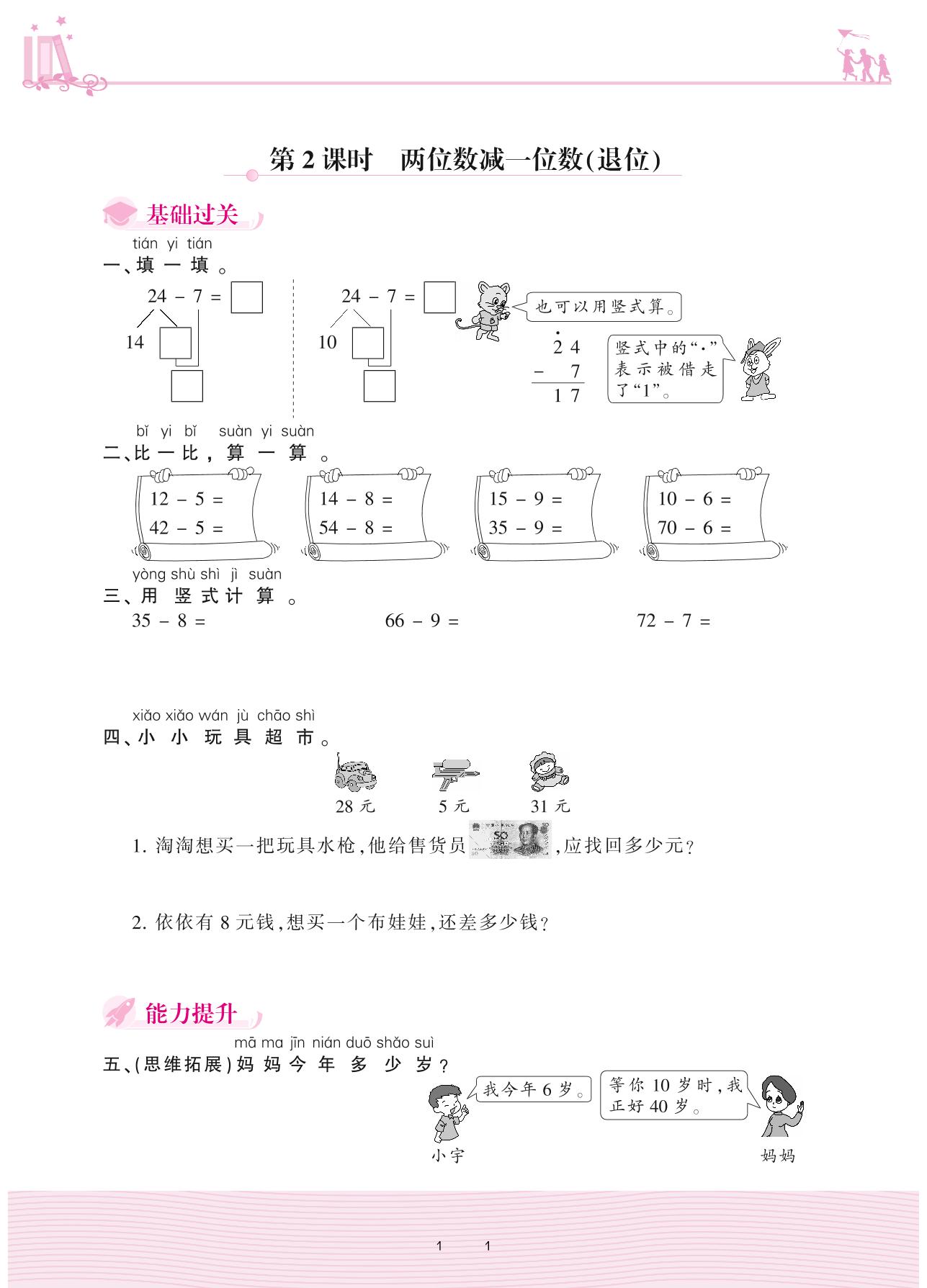 2021下册一年级数学冀教版 五 100以内的加法和减法(一) 4. 两位数减一位数——第2课时 两位数减一位数(退位)