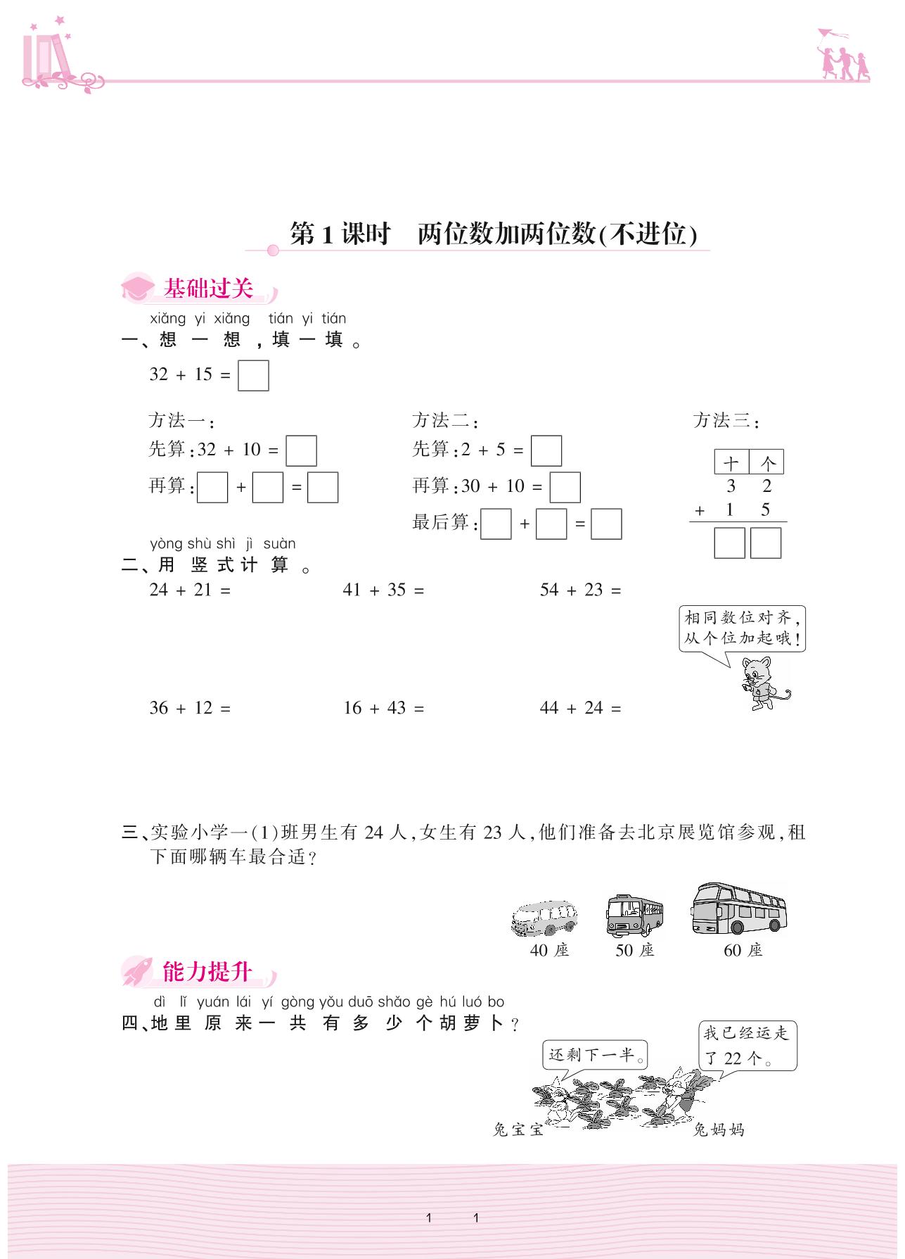 2021下册一年级数学冀教版 七 100以内的加法和减法(二) 1. 两位数加两位数——第1课时 两位数加两位数(不进位)