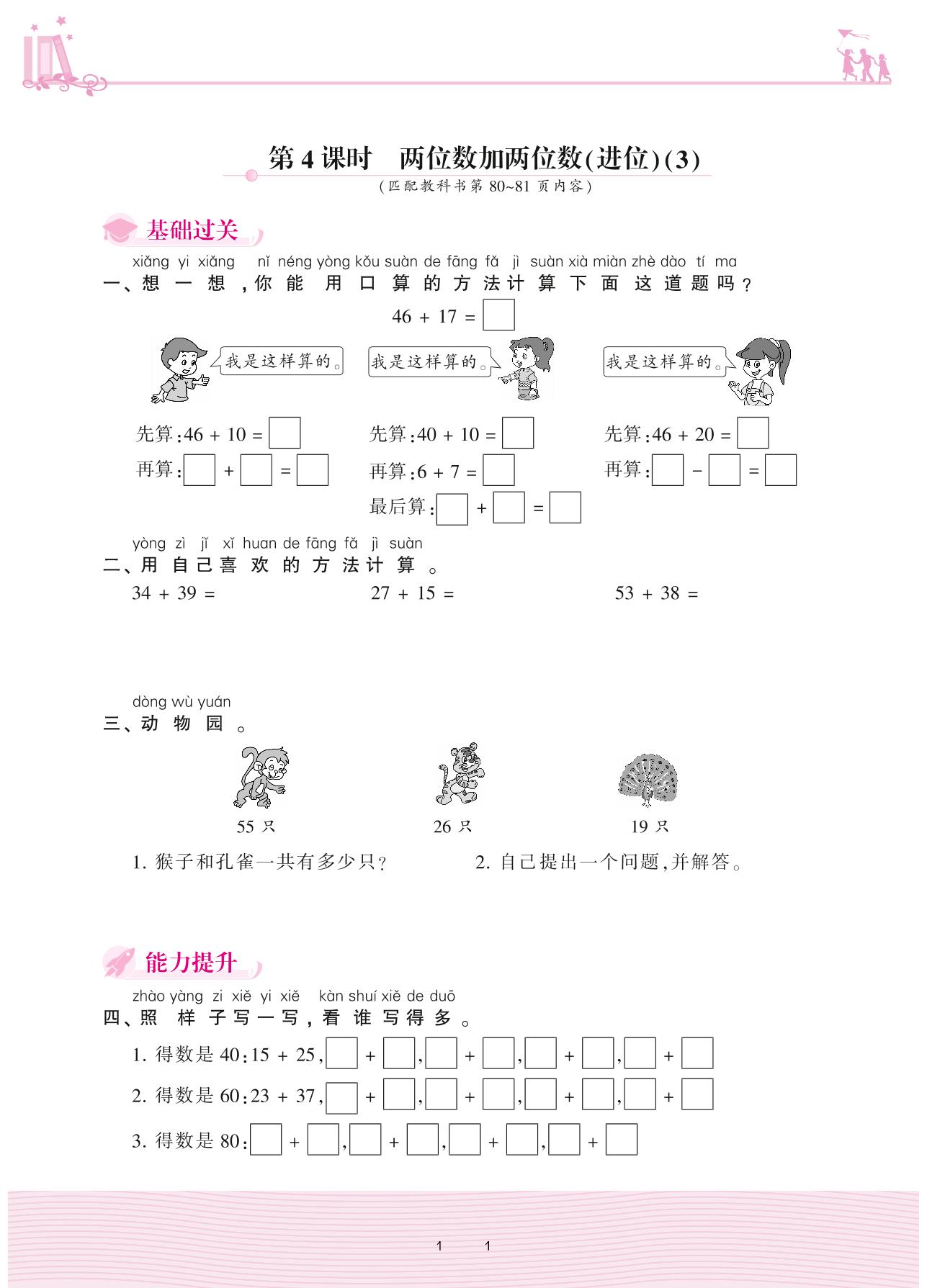 2021下册一年级数学冀教版 七 100以内的加法和减法(二) 1. 两位数加两位数——第4课时 两位数加两位数(进位)(3)