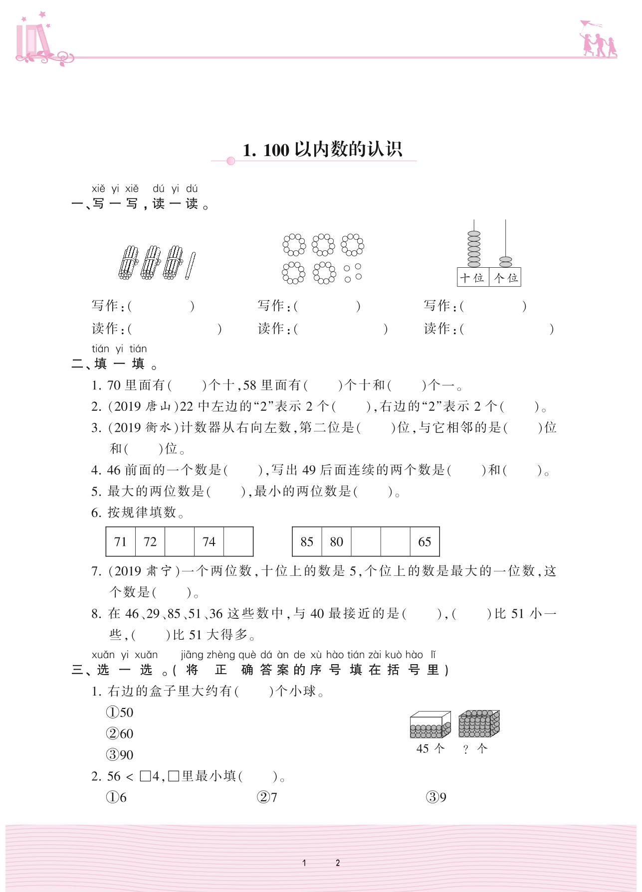 2021下册一年级数学冀教版 整理与评价——1. 100以内数的认识